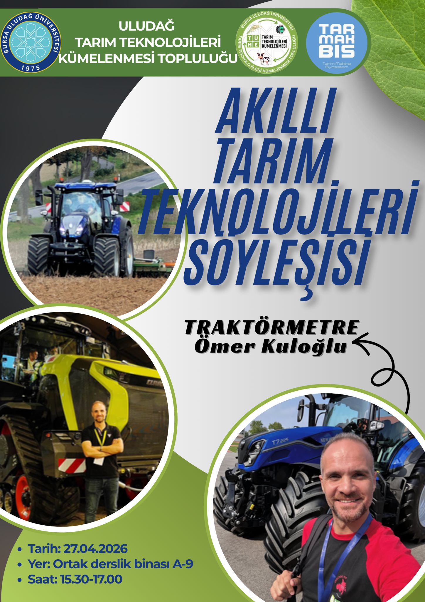 Bursa Uludağ Üniversitesi Tarım Teknolojileri Kümelenmesi (TÜME) Topluluğu ile Biyosistem Mühendisliği öğrencilerinden oluşan, tarım ve tarım teknolojilerinin tanıtımına odaklanan TARMAKBİS YouTube ekibi tarafından düzenlenen Akıllı Tarım Teknolojileri Söyleşisi’ne sizleri davet ediyoruz.