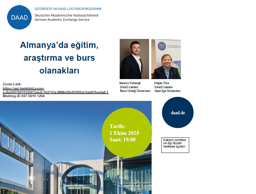 DAAD Lektörümüz Maurice Vollerigh düzenleyeceği etkinlikte DAAD bursları hakkında genel bilgilendirme yapılacaktır.