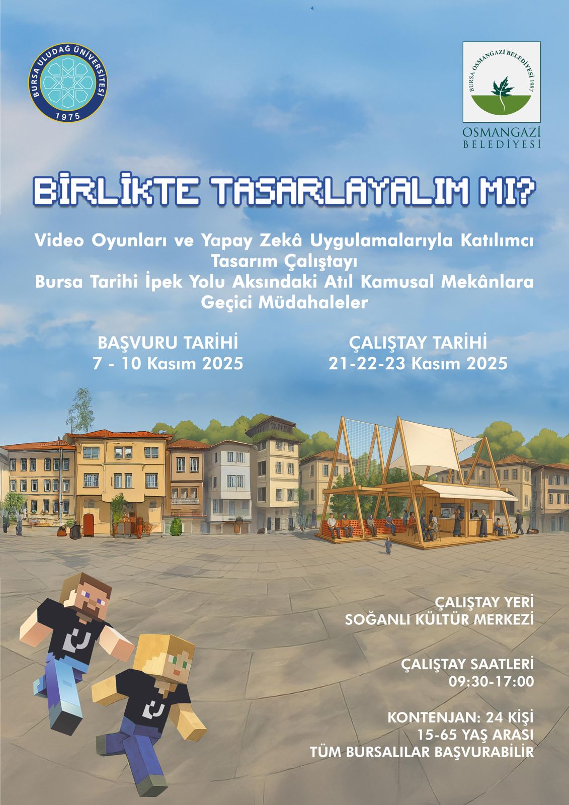 21-22-23 Kasım tarihlerinde Osmangazi Belediyesi’yle Mimarlık Fakültesi ortaklığında Soğanlı Kültür Merkezi'nde yapılacak katılımcı tasarım çalıştayına davetlisiniz. Çalıştayda Bursa'nın fethinin 700. yılı etkinlikleri için kent merkezindeki kamusal mekanlarda kullanılmak üzere pop-up (geçici) mekanlar tasarlanacak ve 2026 yılında belediye tarafından yerinde inşa edilerek kentlilerin kullanımına açılacaktır. Programı talep etmek ve katılmak için