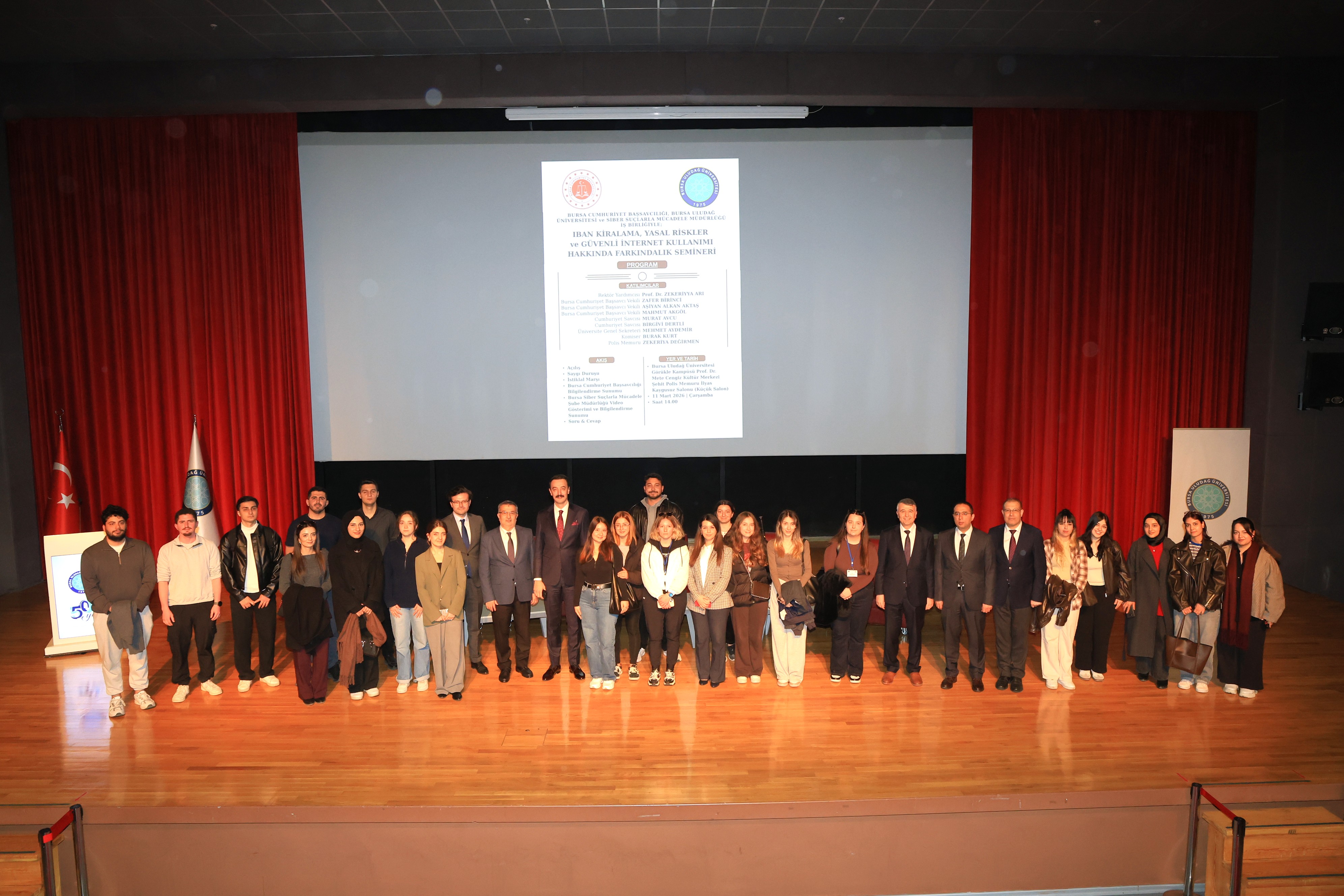 Prof. Dr. Mete Cengiz Kültür Merkezinde gerçekleştirilen etkinlikte, son dönemde özellikle gençleri hedef alan IBAN kiralama yöntemi, suç örgütleri tarafından nasıl kullanıldığı ve bu yöntemin yol açabileceği hukuki sorumluluklar konuşuldu. Programda BUÜ Rektör Yardımcısı Prof. Dr. Zekeriyya Arı, Bursa Cumhuriyet Başsavcı Vekili Zafer Birinci, Bursa Cumhuriyet Başsavcı Vekili Aşiyan Alkan Aktaş, Bursa Cumhuriyet Başsavcı Vekili Mahmut Akgöl, Cumhuriyet Savcısı Murat Avcu, Cumhuriyet Savcısı Birgivi Dertli, Üniversite Genel Sekreteri Mehmet Aydemir, Komiser Burak Kurt ve Polis Memuru Zekeriya Değirmen konuşmacı olarak yer aldı.