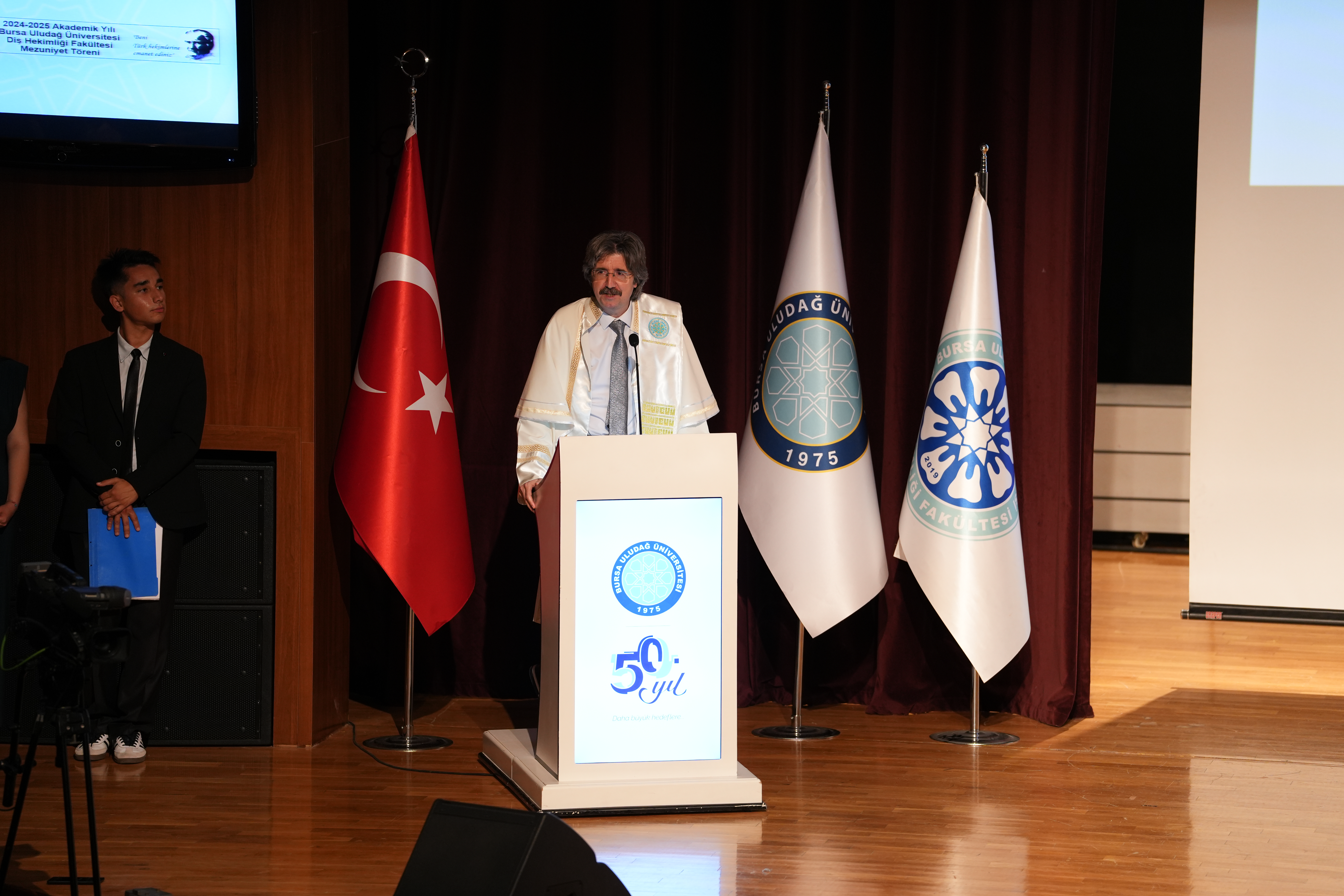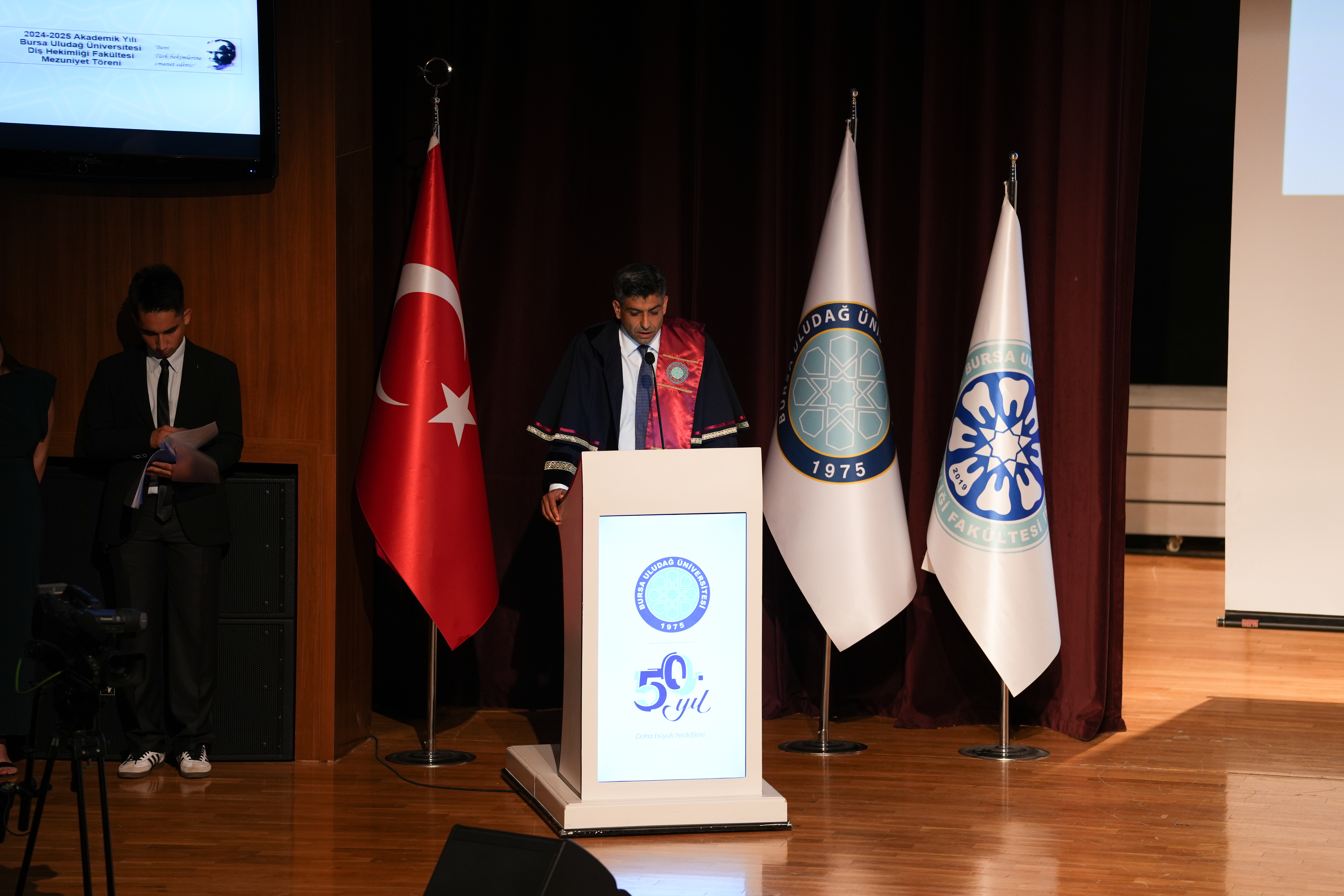 Saygı duruşu ve İstiklal Marşı ile başlayan törende Fakülte Dekanı Prof. Dr. A. Alper PAMPU; 2019 yılında kurucu Dekan olarak atanan Prof. Dr. Halil SAĞLAM ile birlikte Fakültenin 2020-2021 eğitim-öğretim yılında ilk öğrencilerini kabul ederek eğitime başladığını hatırlattı. Aynı dönemde Bursa Ağız ve Diş Sağlığı Eğitim ve Araştırma Hastanesi ile yapılan protokol sayesinde hasta tedavi hizmetlerine başlandığını belirtti. PAMPU, Fakülteye modern bir bina kazandıran bağışları için iş insanı İbrahim GÜLMEZ’e teşekkür ederek, yakın zamanda eğitim ve sağlık hizmetlerinin bu binada yürütüleceğini ifade etti.