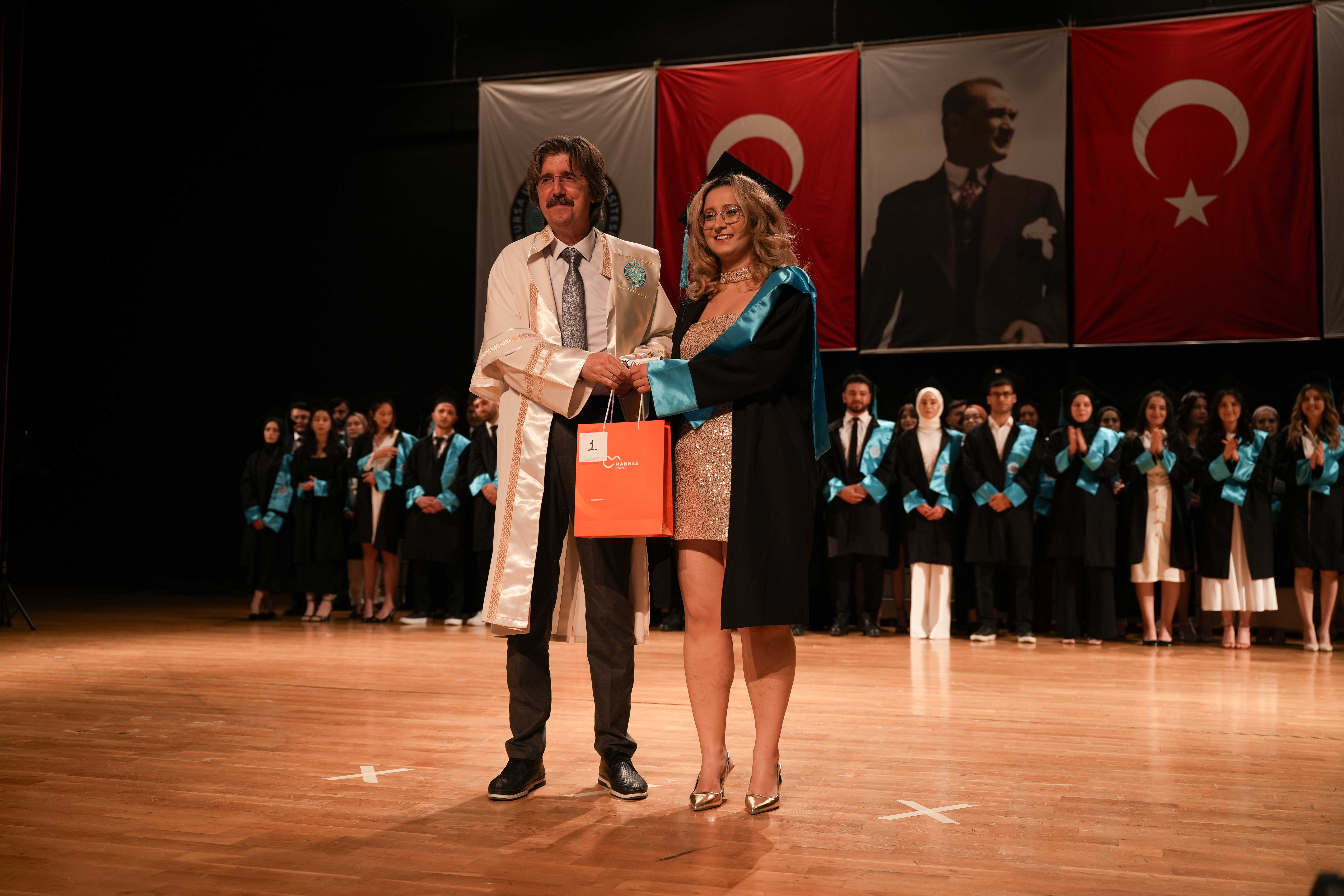Program kapsamında Dönem IV öğrencisi Giray SAVAŞ’ın piyano dinletisi ve Fakülte müzik topluluğunun sahne aldığı program törene renk kattı. Fakülte birincisi Melisa KESTEL, ikincisi Beyza Nur MACİT ve üçüncüsü Fatma ELRİ ödüllerini aldı. Fakülte birincisi Melisa KESTEL mezuniyet kütüğüne adını taşıyan ilk plaketini çakarak Fakülte tarihine ilk imzayı bıraktı ve tüm mezunlar adına duygu ve düşüncelerini paylaştı.