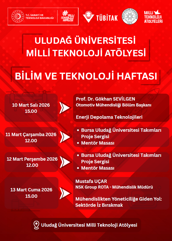 Uludağ Üniversitesi Millî Teknoloji Atölyesi, TÜBİTAK iş birliği ve Millî Teknoloji Hamlesi vizyonu doğrultusunda Bilim ve Teknoloji Haftası’nı çeşitli etkinliklerle gerçekleştirmektedir.