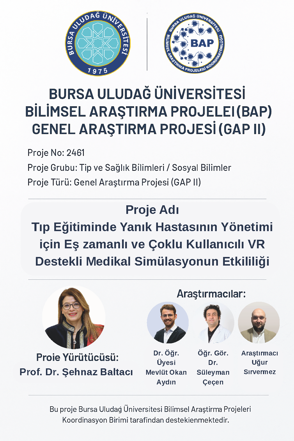 Bursa Uludağ Üniversitesi Bilimsel Araştırma Projeleri (BAP) Koordinasyon Birimi tarafından desteklenen “Tıp Eğitiminde Yanık Hastasının Yönetimi için Eş Zamanlı ve Çoklu Kullanıcılı VR Destekli Medikal Simülasyonun Etkililiği” başlıklı proje, Bilgisayar ve Öğretim Teknolojileri Eğitimi Anabilim Dalından Prof. Dr. Şehnaz Baltacı yürütücülüğünde hayata geçirilmektedir.