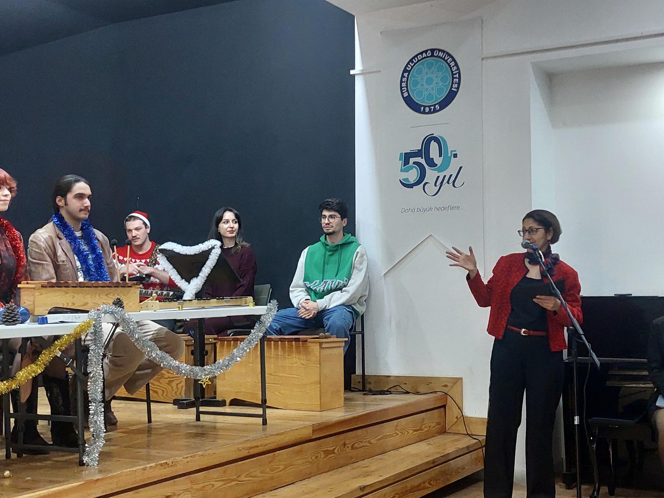 On January 6, 2026, a meaningful concert event was held within the Department of Music Education, Division of Fine Arts Education, Faculty of Education at Bursa Uludağ University. Titled “Welcoming the New Year with Melodies from Around the World,” the concert brought together audiences with performances by students of the Orff Instruments Course, the Ukulele Class, and members of the BUU Polyphonic Music Ensemble (ÇSMT), under the coordination of Prof. Dr. Sezen Özeke.