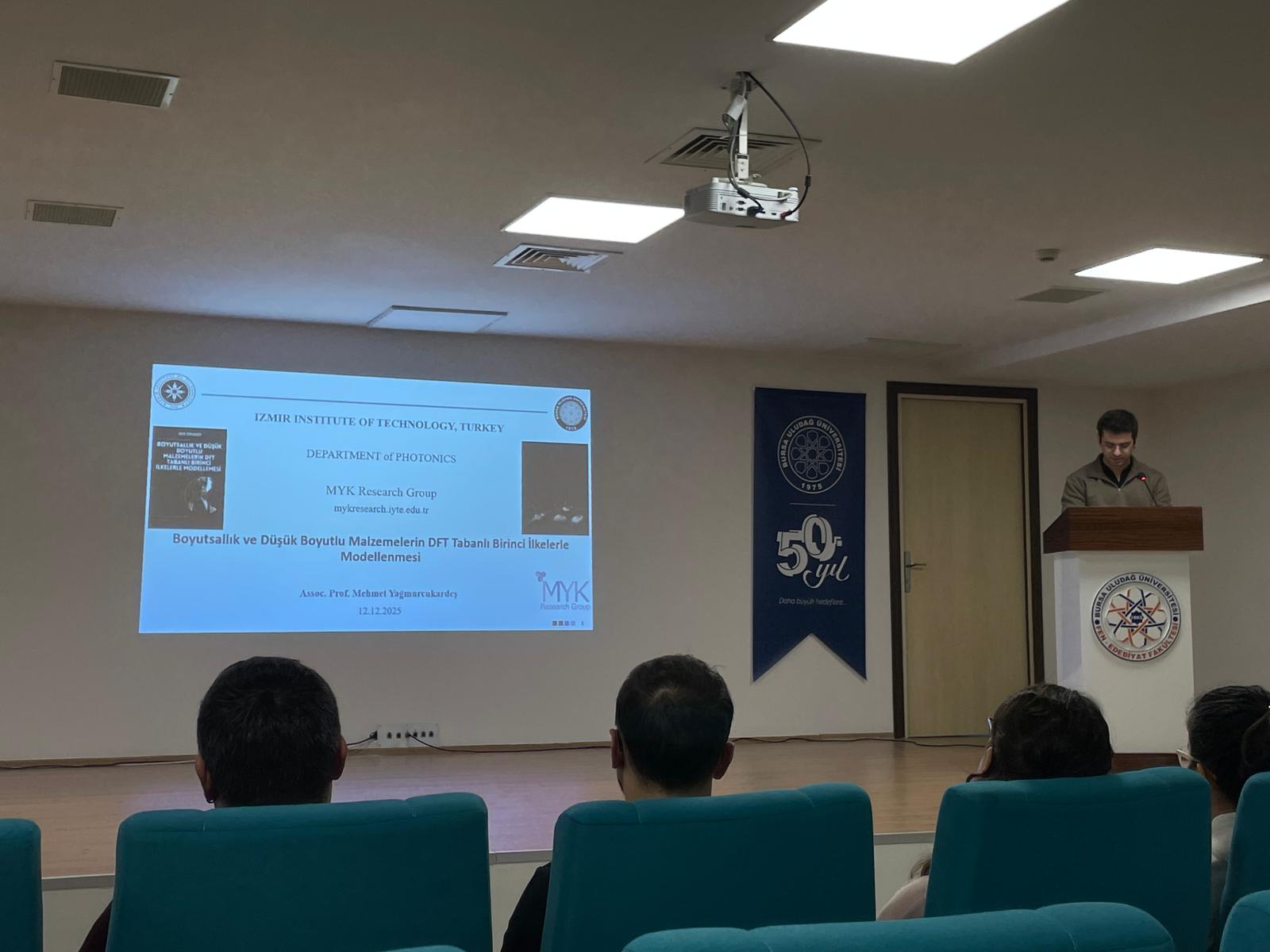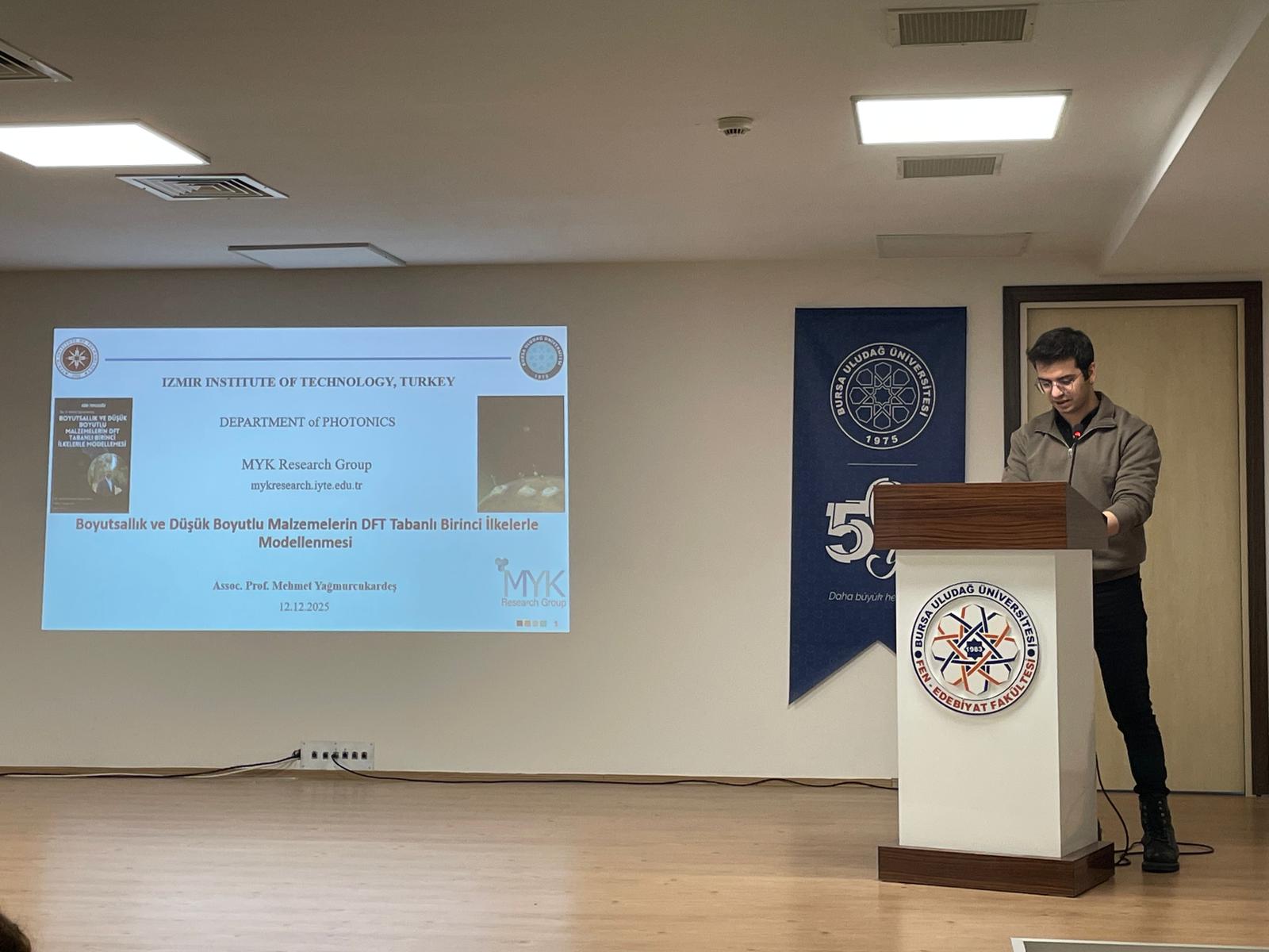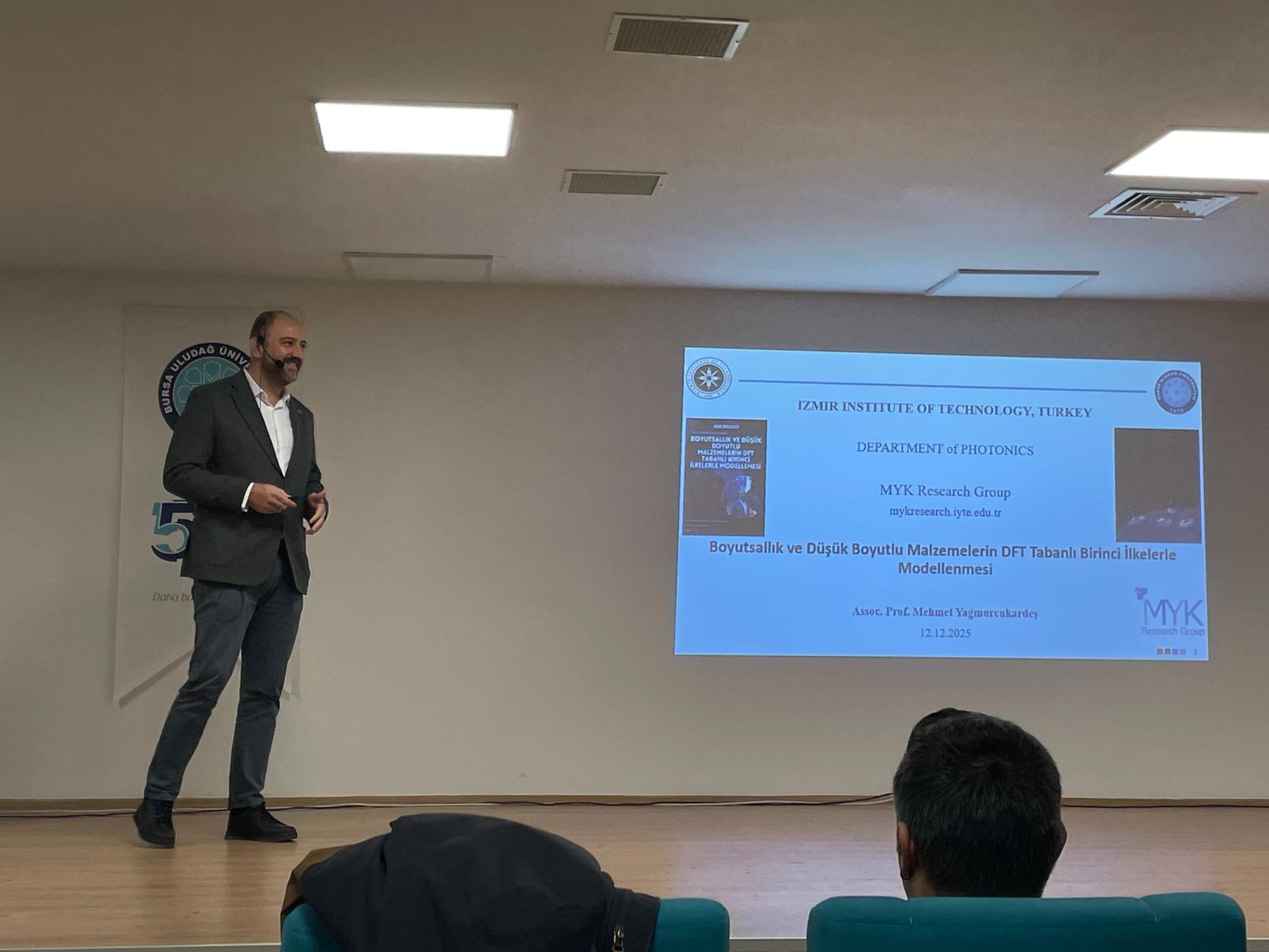 Bursa Uludağ Üniversitesi Fizik Topluluğu tarafından düzenlenen ve İzmir Yüksek Teknoloji Enstitüsü (İYTE) Öğretim Üyesi Doç. Dr. Mehmet YAĞMURCUKARDEŞ’in konuşmacı olarak katıldığı "Boyutsallık ve Düşük Boyutlu Malzemelerin DFT Tabanlı Birinci İlkelerle Modellenmesi" başlıklı seminerimiz, 12 Aralık 2025 tarihinde başarıyla gerçekleştirildi.