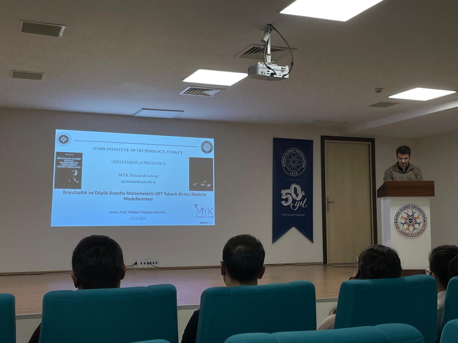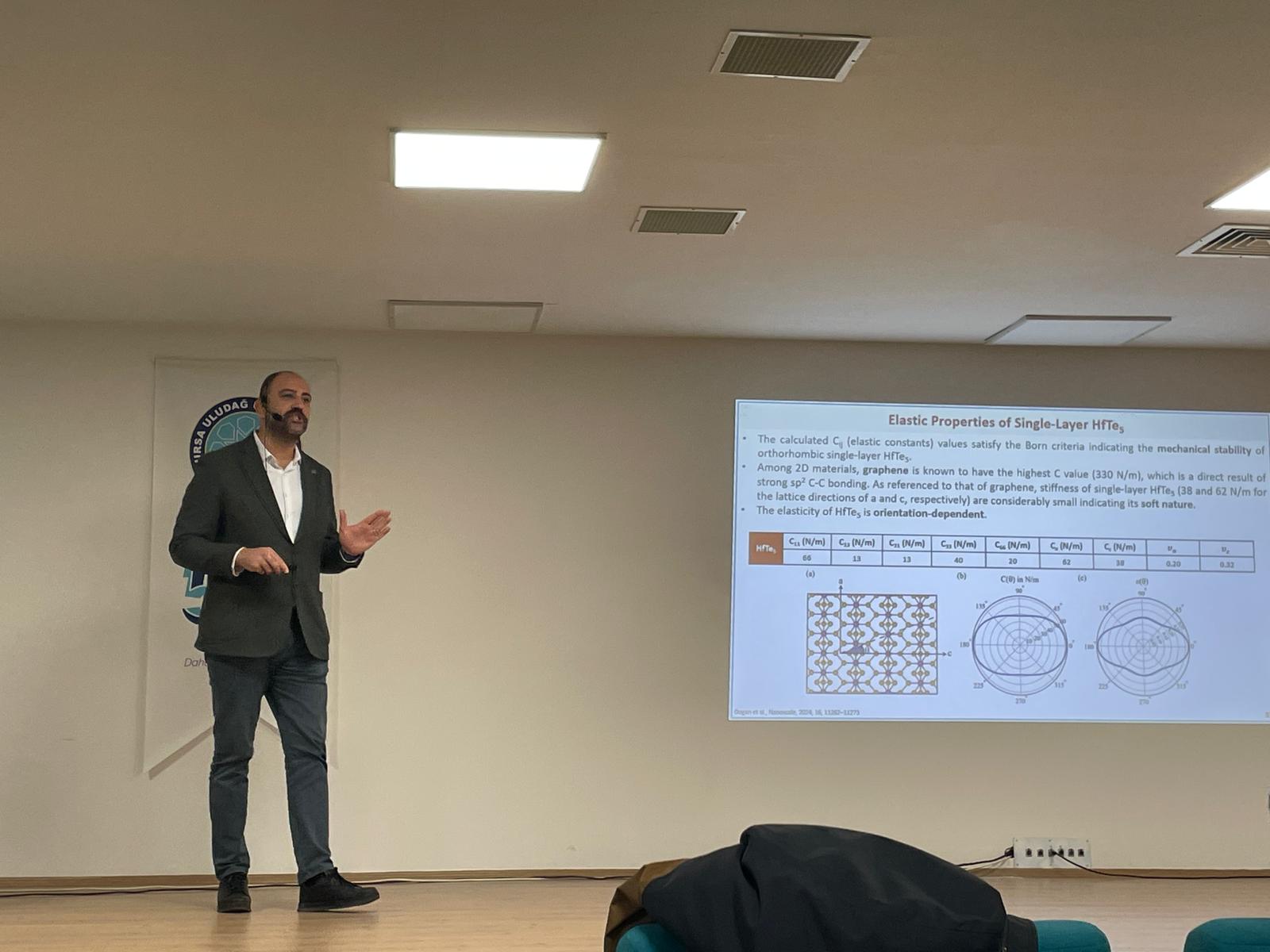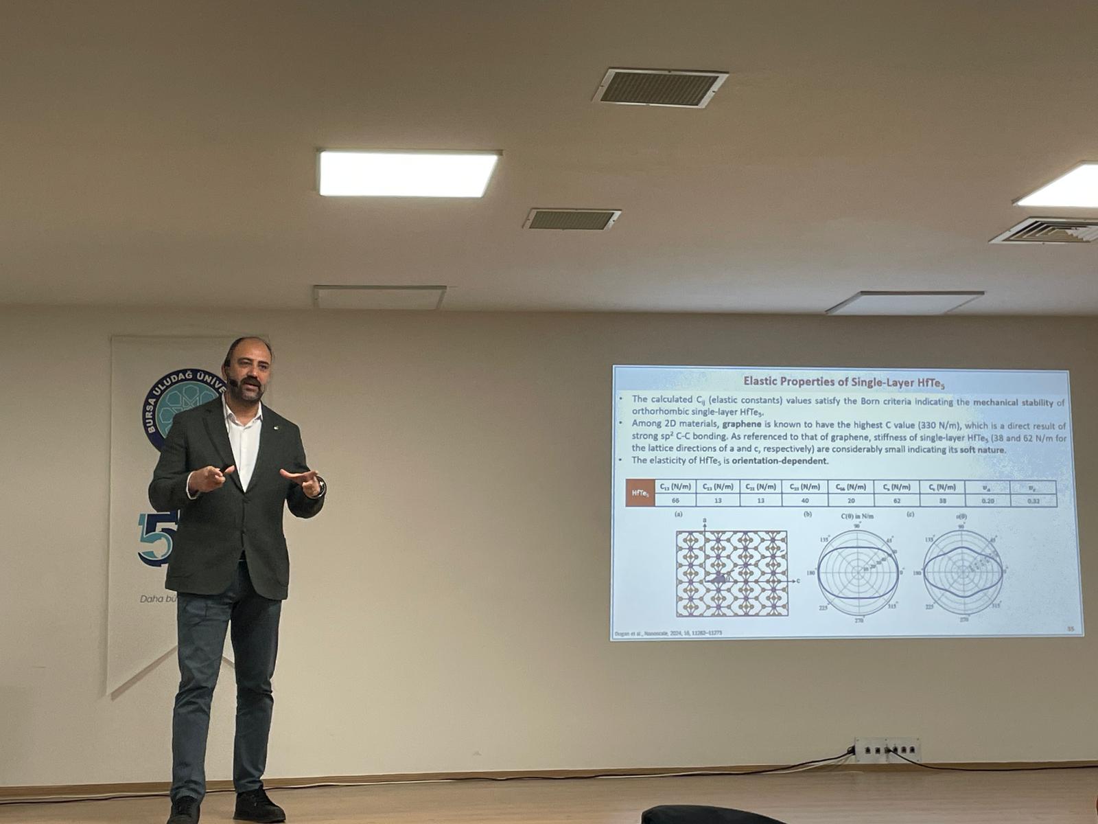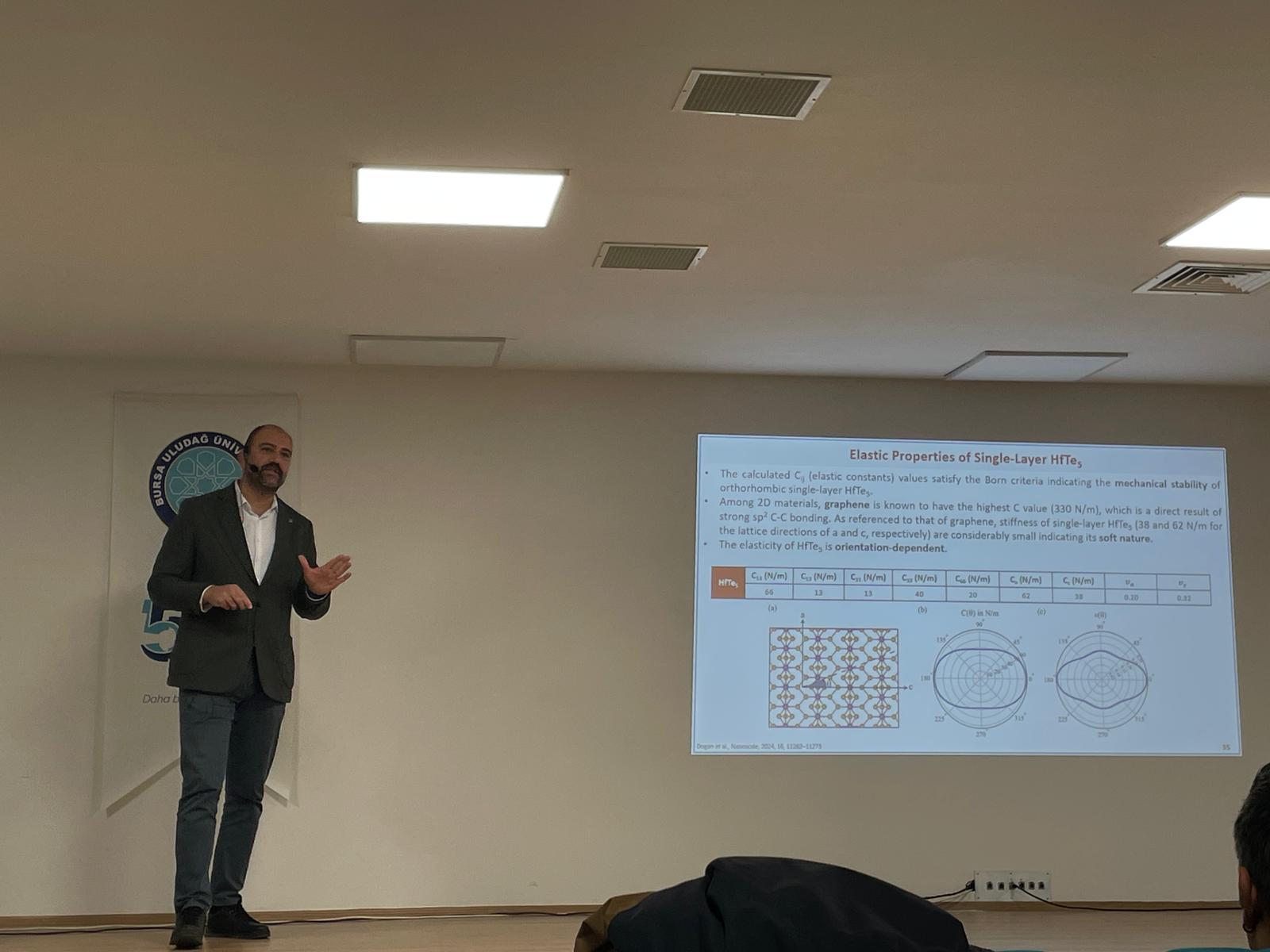 Bursa Uludağ Üniversitesi Fizik Topluluğu tarafından düzenlenen ve İzmir Yüksek Teknoloji Enstitüsü (İYTE) Öğretim Üyesi Doç. Dr. Mehmet YAĞMURCUKARDEŞ’in konuşmacı olarak katıldığı "Boyutsallık ve Düşük Boyutlu Malzemelerin DFT Tabanlı Birinci İlkelerle Modellenmesi" başlıklı seminerimiz, 12 Aralık 2025 tarihinde başarıyla gerçekleştirildi.