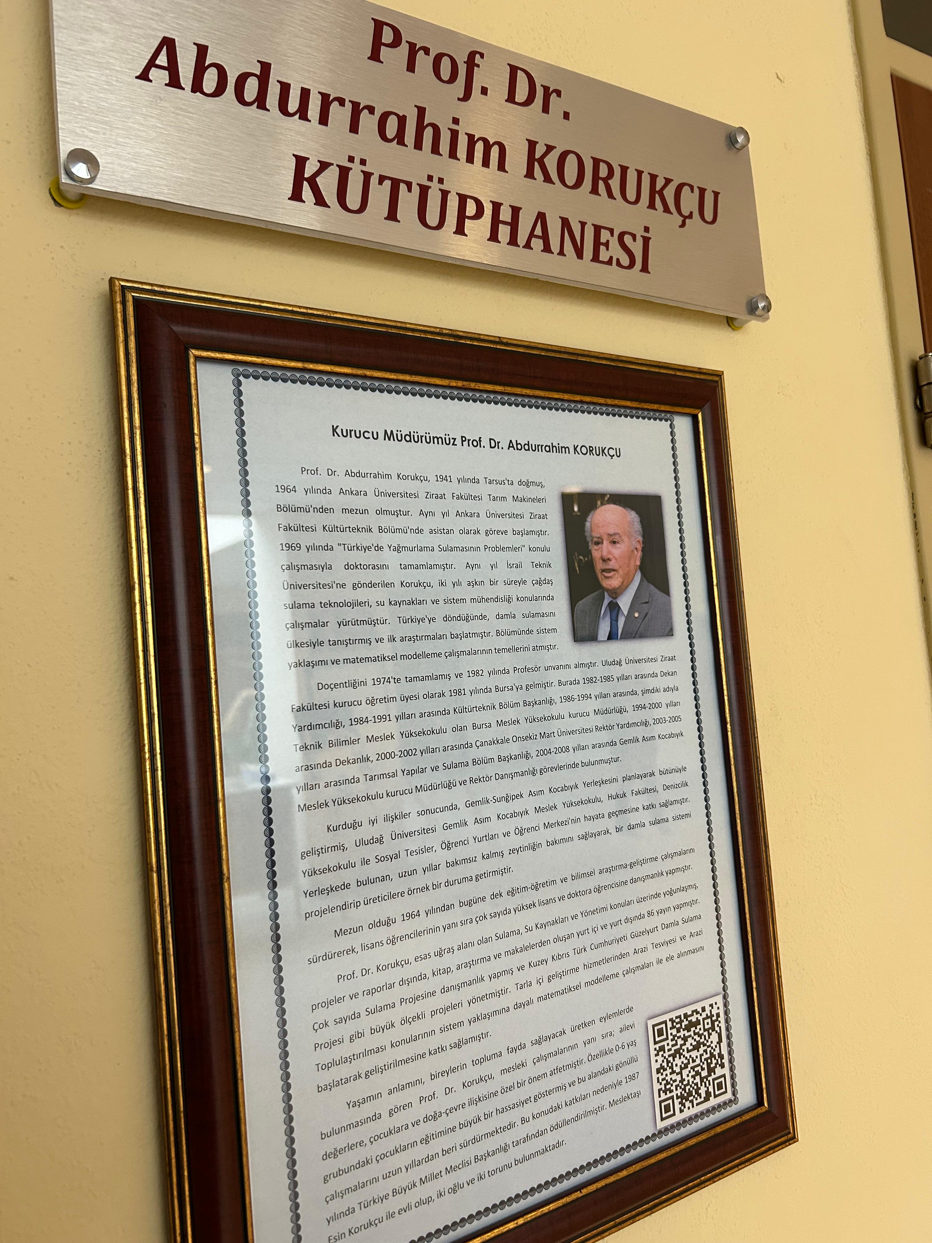 Üniversitemiz Senatosu’nun 2025/18 sayılı oturumunda alınan karar doğrultusunda, Meslek Yüksekokulumuza sunduğu değerli katkılar nedeniyle Meslek Yüksekokulumuz bünyesinde yer alan kütüphaneye, Kurucu Müdürümüz Prof. Dr. Abdurrahim KORUKÇU’nun adı verilmiştir.