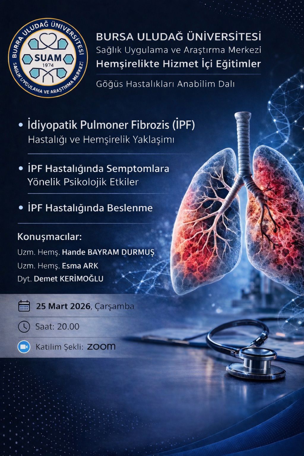 Bursa Uludağ Üniversitesi Sağlık Uygulama ve Araştırma Merkezi bünyesinde, Göğüs Hastalıkları Anabilim Dalı tarafından düzenlenen hizmet içi eğitim programı, 25 Mart 2026 tarihinde çevrim içi platform (Zoom) aracılığıyla gerçekleştirilmiştir.