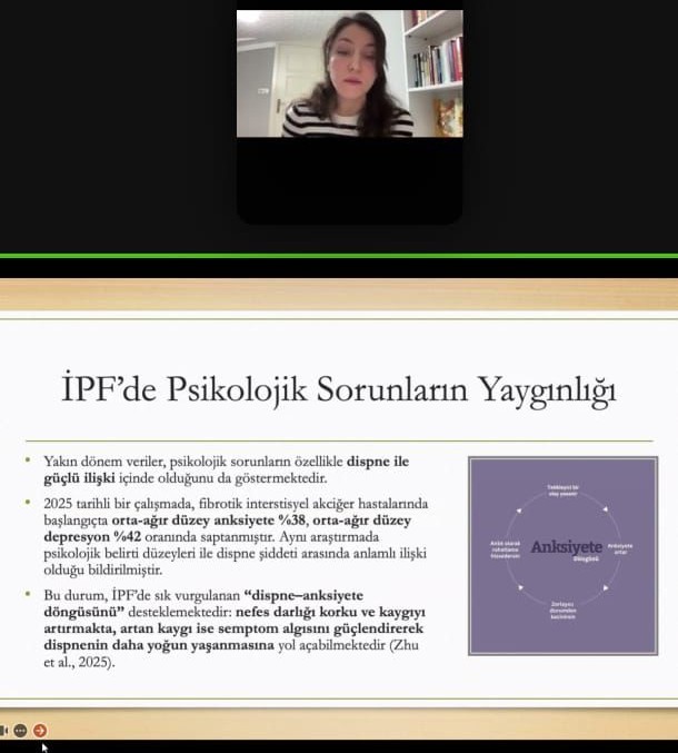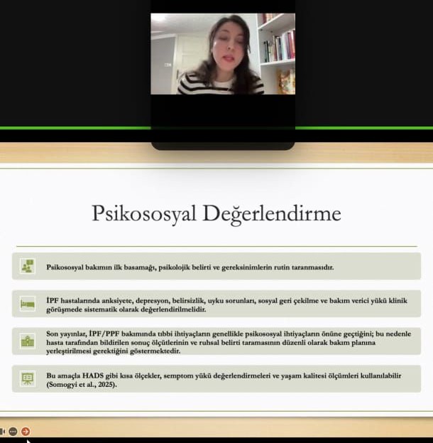 Eğitim kapsamında; İdiyopatik Pulmoner Fibrozis (İPF) hastalığı ve hemşirelik yaklaşımı Uzman Hemşire Hande Bayram Durmuş tarafından, İPF hastalığında semptomlara yönelik psikolojik etkiler Uzman Hemşire Esma Ark tarafından ve İPF hastalığında beslenme yaklaşımları Diyetisyen Demet Kerimoğlu tarafından ele alınmıştır.