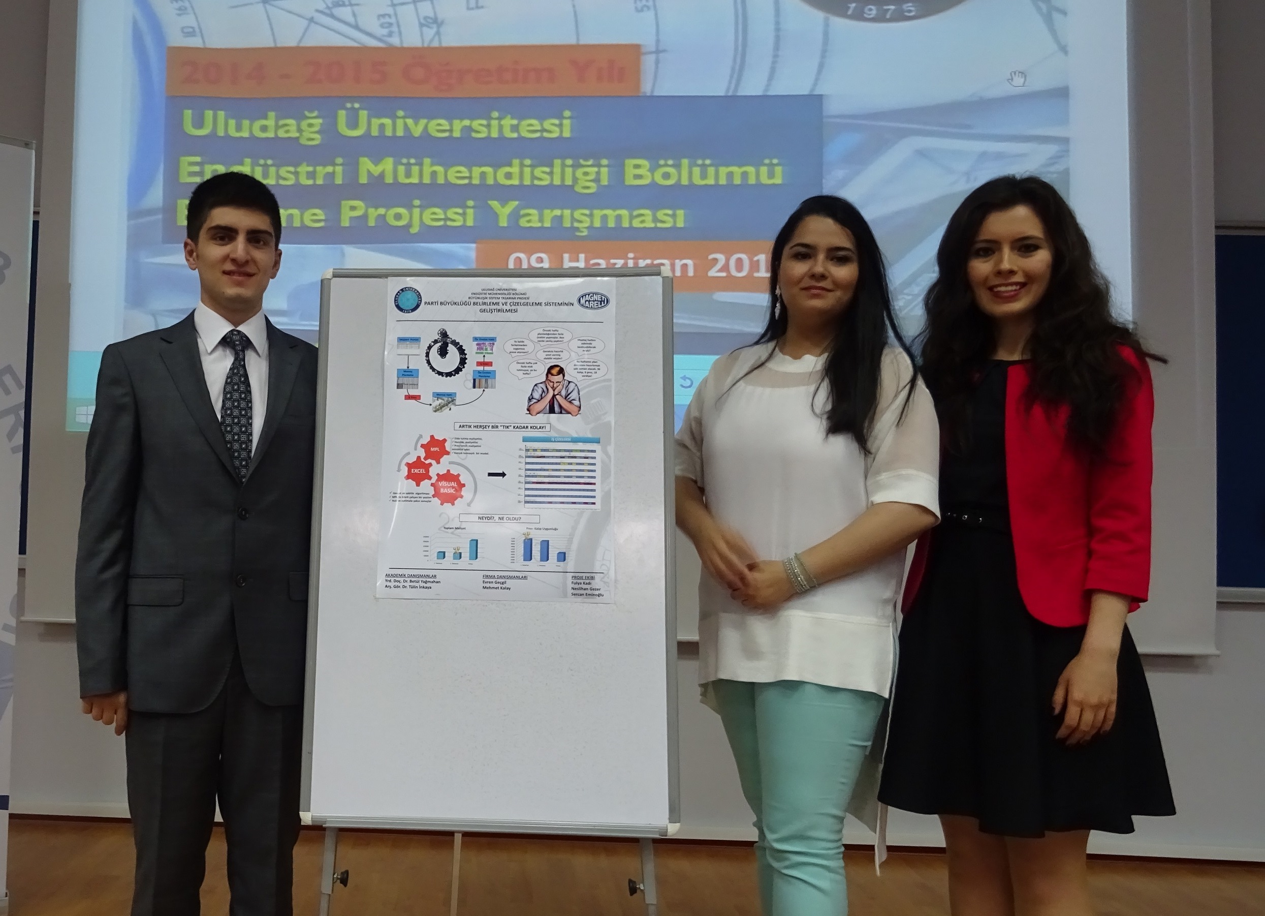 Ortadogu Teknik Üniversitesi’nde (ODTÜ) gerçeklestirilen 35. Yöneylem Arastirmasi ve Endüstri Mühendisligi Ulusal Kongresi (YAEM 2015) Ögrenci Proje Yarismasi’nda Uludag Üniversitesi Endüstri Mühendisligi ögrencilerine ödül geldi. U.Ü. Mühendislik Fakültesi Endüstri Mühendisligi Bölümü ögrencileri Sercan Eminoglu, Neslihan Gezer ve Fulya Kadi’nun olusturdugu ekip hazirladiklari ‘Bir otomotiv yan sanayi firmasi için parti büyüklügü belirleme ve çizelgeleme sisteminin gelistirilmesi’ isimli proje ile 49 proje arasindan en iyi ikinci proje seçilerek ödüle layik görüldü.