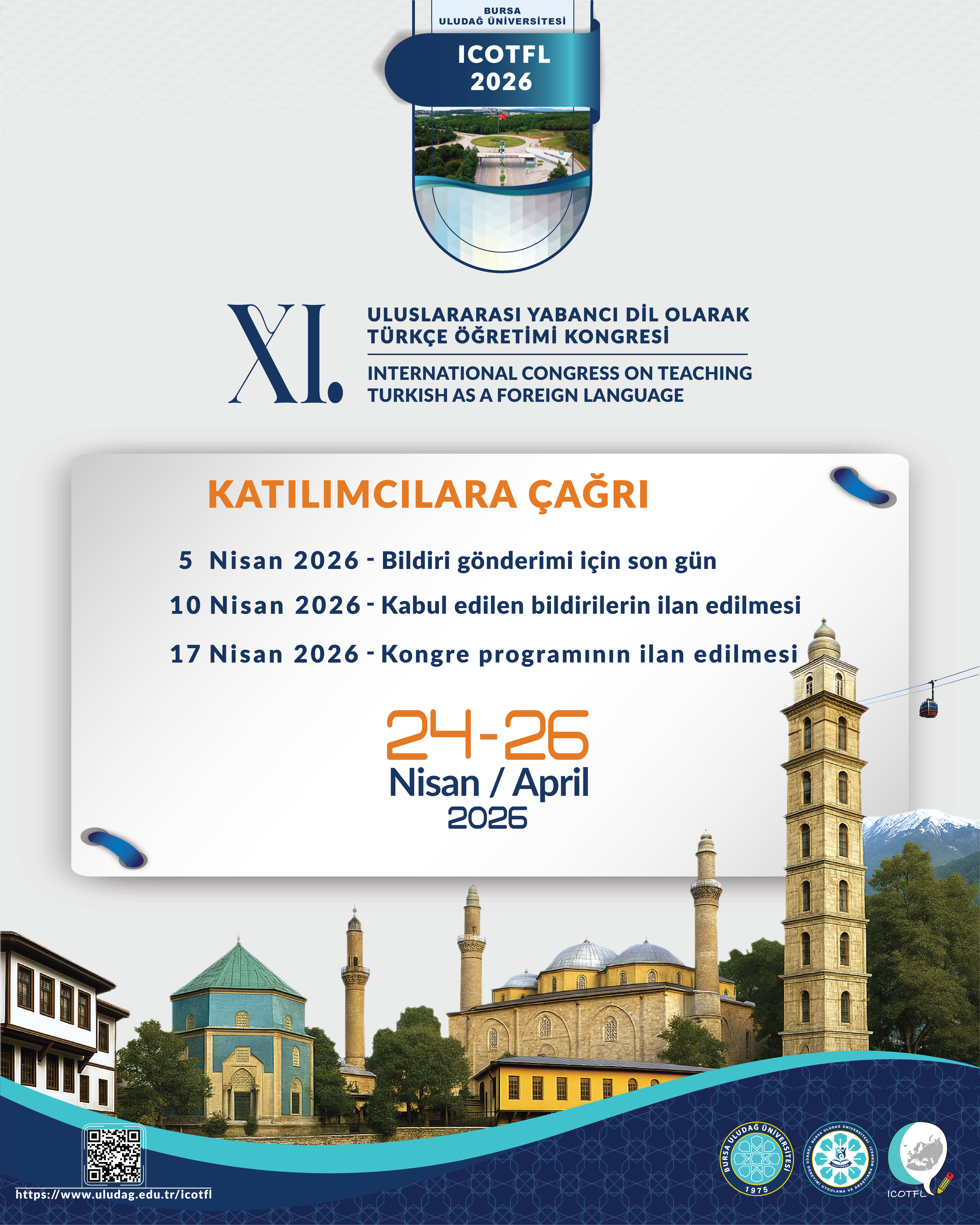 XI. Uluslararası Yabancı Dil Olarak Türkçe Öğretimi Kongresi (International Congress of Teaching Turkish as a Foreign Language – ICOTFL 2026) Bursa Uludağ Üniversitesi ev sahipliğinde Türkçe Öğretimi Uygulama ve Araştırma Merkezi (ULUTÖMER) ile Eğitim Fakültesi Türkçe ve Sosyal Bilimler Eğitimi Bölümü koordinasyonunda yüz yüze ve çevrim içi (sadece yurt dışı katılımcıları için) olarak gerçekleştirilecektir.