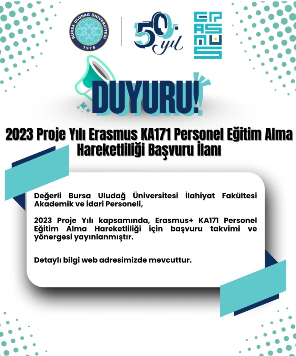 2023 Proje Yılı kapsamında, Erasmus+ KA171 Personel Eğitim Alma Hareketliliği için başvuru takvimi ve yönergesi yayınlanmıştır. Bu ilan, Cezayir’de ilgili alanlarda eğitim almak, işbaşı gözlem yapmak veya mesleki gelişim faaliyetlerine katılmak isteyen İlahiyat Fakültesi akademik ve idari personeline yöneliktir.