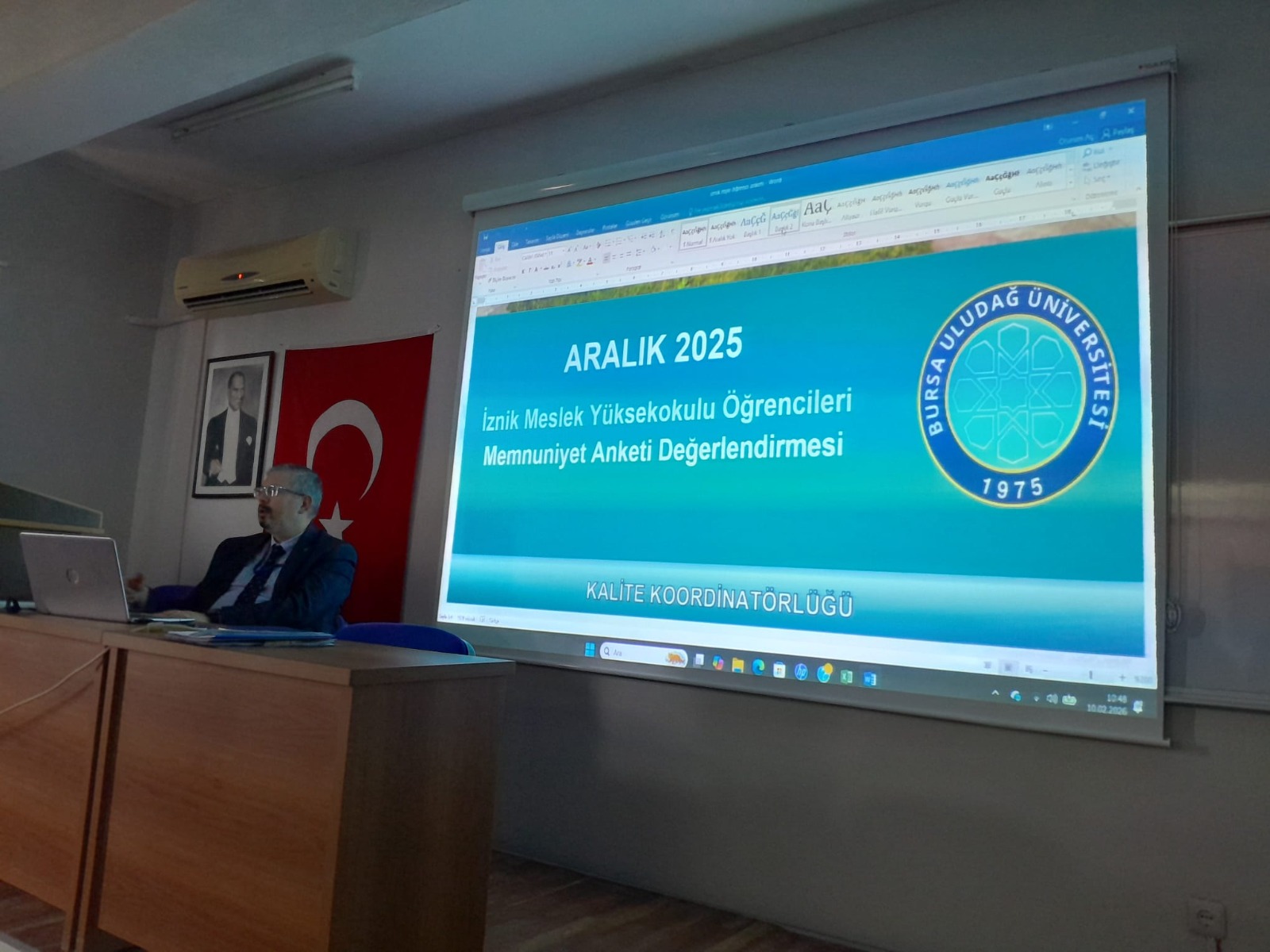 Müdür ÇELİK, Üniversitemiz üst yönetimi tarafından her sene yapılan Memnuniyet Anketinin genel sonuçlarını takdim ederek, “Anketlerde, öğrenciye sunulan hizmetlerde, yönetsel ve genel eğitim çalışmaları, idari personelin, öğrenci işleri biriminin, güvenlik ve temizlik personelinin yaptığı çalışmalar ile değerlendirilmektedir. Bu nedenle, Yüksekokulumuzda çalışan tüm idari personelin elinden gelenin en iyisini yapması gerekir. 2026 yılında yapılacak Memnuniyet Anketi verileri Yüksekokulumuz ve Üniversitemiz açısından önem taşımaktadır. Eksik yönlerimizi tamamlayarak, elbirliği ile çalışmalarımızı sürdüreceğiz” açıklamasını yaptı.