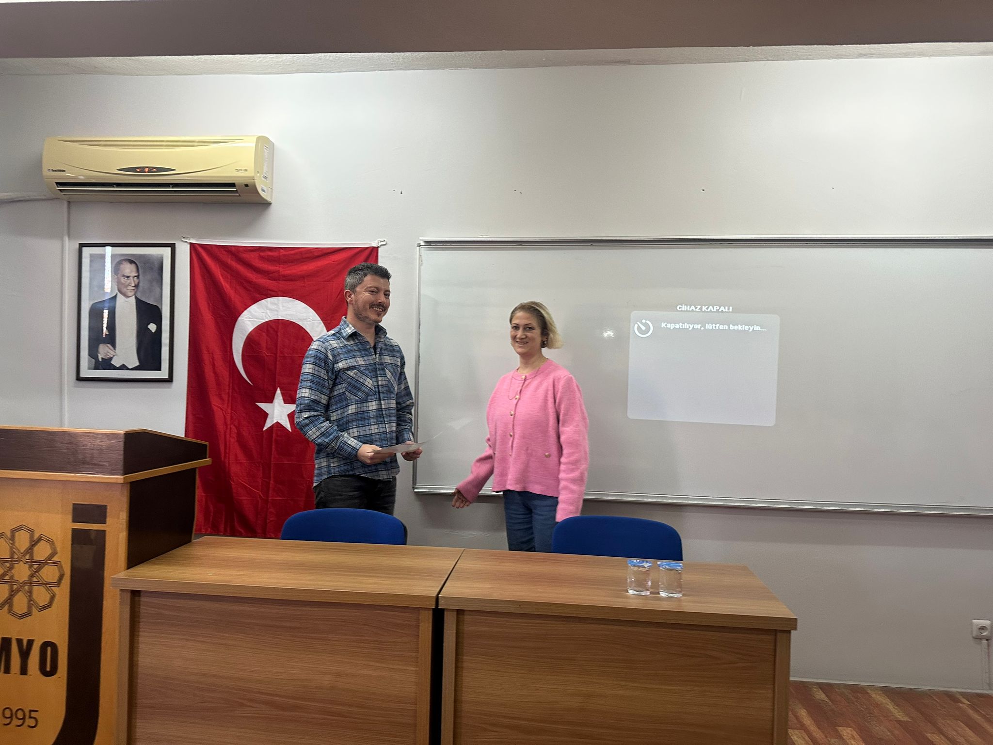 Bilgilendirme seminerinin sonunda, İznik MYO Müdür Yardımıcısı Öğretim Görevlisi Aylin AYDIN SEL tarafından Erasmus Koordinatörlüğü Proje Uzmanı Dr. Apti Onuk’ a teşekkür belgesi takdim edildi.