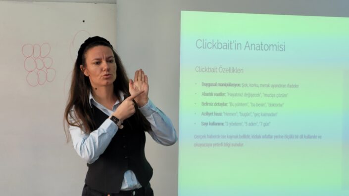 Kent Bursa Gazetesi Sorumlu Yazı İşleri Müdürü Yasemin Özkerem, sunum boyunca haber başlıklarının öneminden, clickbait anatomisinden, sosyal medyada sağlıkla ilgili bilgi krizinden ve bir içeriğin ‘haber mi yoksa reklam mı?’ karmaşasından söz etti.