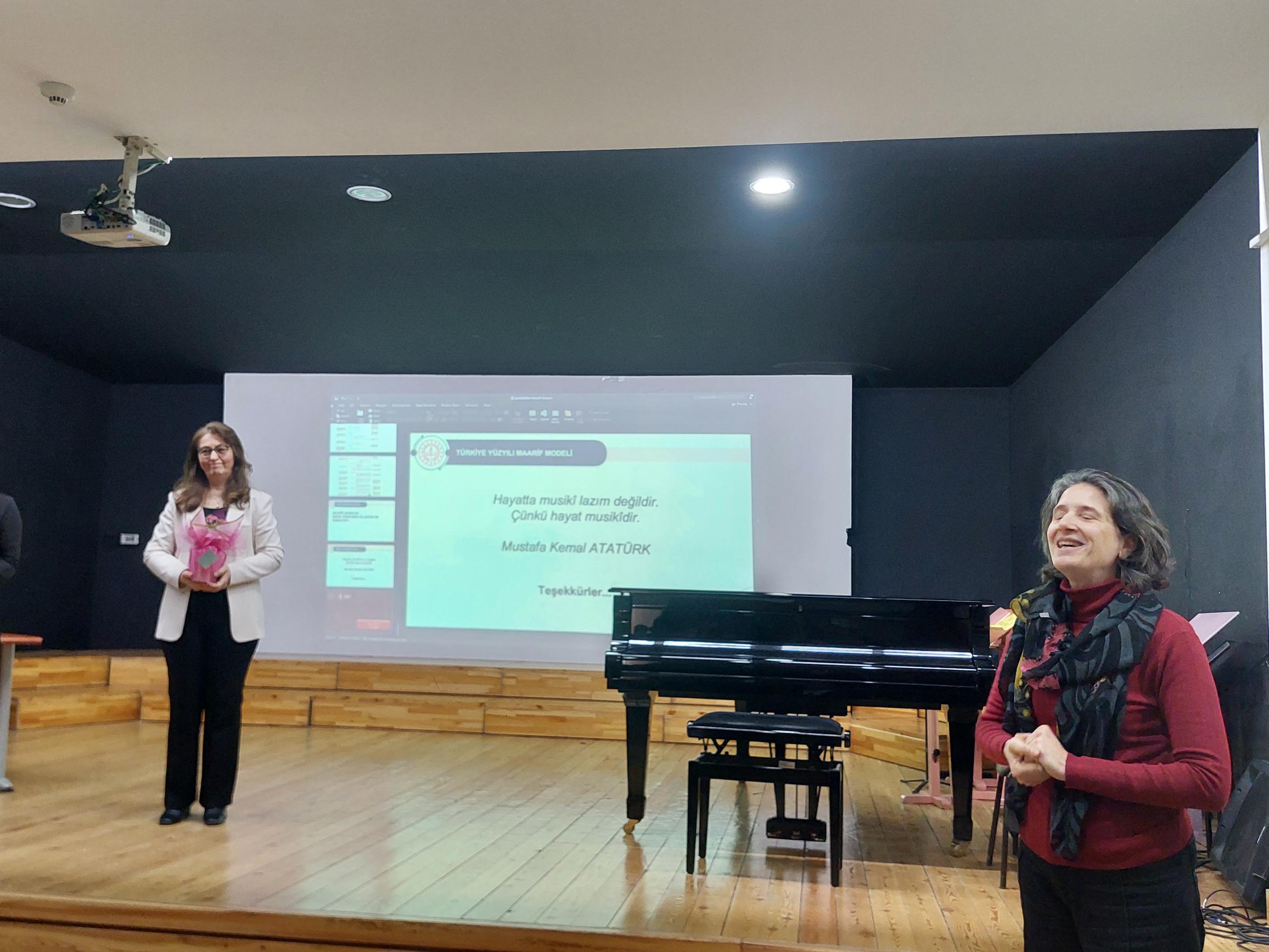 Genel müzik eğitimi programının ortaöğretim kademesini yapılandıran ekipte yer alan ve ana bilim dalımızın mezunları olan Şule Nurdan Caf ile Gülen Çimek öğretmenlerimize değerli sunumları için teşekkür ederiz.