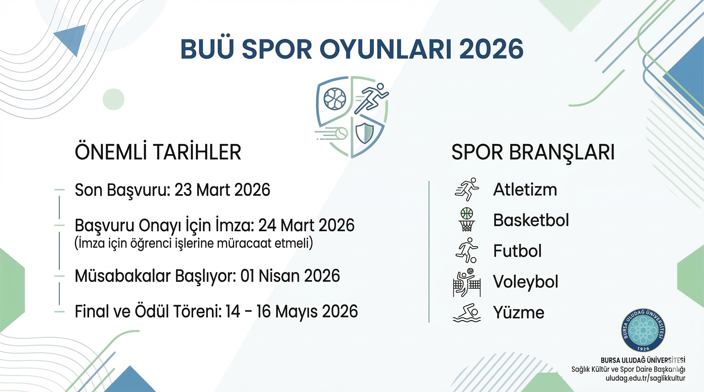 Bursa Uludağ Üniversitesi Spor Oyunları 2026: Branş Kuralları ve Katılım Detayları Bursa Uludağ Üniversitesi Sağlık Kültür ve Spor Daire Başkanlığı tarafından düzenlenen, sporu sevdirmeyi ve düzenli spor alışkanlığını teşvik etmeyi amaçlayan "BUÜ Spor Oyunları" heyecanı başlıyor. Üniversitemiz akademik ve idari birimlerinin öğrenci ve personelinin katılımıyla gerçekleştirilecek bu büyük organizasyonda sen de yerini al! Genel Bilgiler