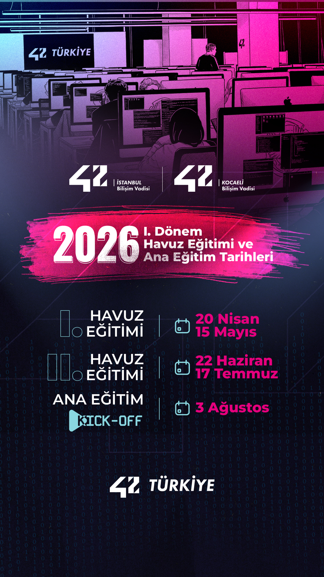 T.C. Sanayi ve Teknoloji Bakanlığı’nın himayelerinde ve Bilişim Vadisi yürütücülüğünde faaliyetlerini sürdüren 42 Türkiye’de, 2026 yılı eğitim dönemine yönelik Havuz Eğitimi ve Ana Eğitim programlarının başvuru süreci devam etmektedir. 2021 yılından bu yana Türkiye’de faaliyet gösteren 42 Türkiye; 42 İstanbul ve 42 Kocaeli kampüslerinde yazılım eğitimi sunmaktadır. Bugün itibarıyla 800’ün üzerinde aktif öğrencinin eğitimine devam ettiği program kapsamında, 350’nin üzerinde mezun teknoloji ekosistemine kazandırılmıştır. 42 Türkiye, ülkemizin nitelikli yazılım geliştirici ihtiyacının karşılanmasına katkı sağlamayı ve Milli Teknoloji Hamlesi hedefleri doğrultusunda insan kaynağının geliştirilmesini desteklemeyi amaçlamaktadır. Uygulanan eğitim modeli, tamamen ücretsiz olarak sunulmakta olup kampüsler haftanın 7 günü 24 saat öğrencilerin erişimine açıktır. Proje tabanlı ve akran öğrenimine dayanan bu modelde öğrenciler, klasik sınıf ve eğitmen yaklaşımından farklı olarak gerçek proje deneyimleri üzerinden öğrenmekte, kendi öğrenme süreçlerini yöneterek teknik bilgi, problem çözme ve ekip çalışması yetkinliklerini geliştirmektedir. 42 Türkiye, dünya genelinde yazılım eğitimine getirdiği yenilikçi yaklaşım ile öne çıkan uluslararası 42 Network’ün bir parçasıdır. 42 Network, bugün itibarıyla 32 ülkede 58 kampüsü, 25.000’in üzerinde aktif öğrencisi ve 49.000’in üzerinde mezunu ile küresel ölçekte faaliyet göstermektedir. Tüm kampüslerde ortak müfredat uygulanmakta olup, öğrenciler uluslararası standartlarda ve teknik yetkinliklerle yetiştirilmektedir. 42 Türkiye eğitim programına başvuru ve kabul süreci aşağıdaki aşamalardan oluşmaktadır: