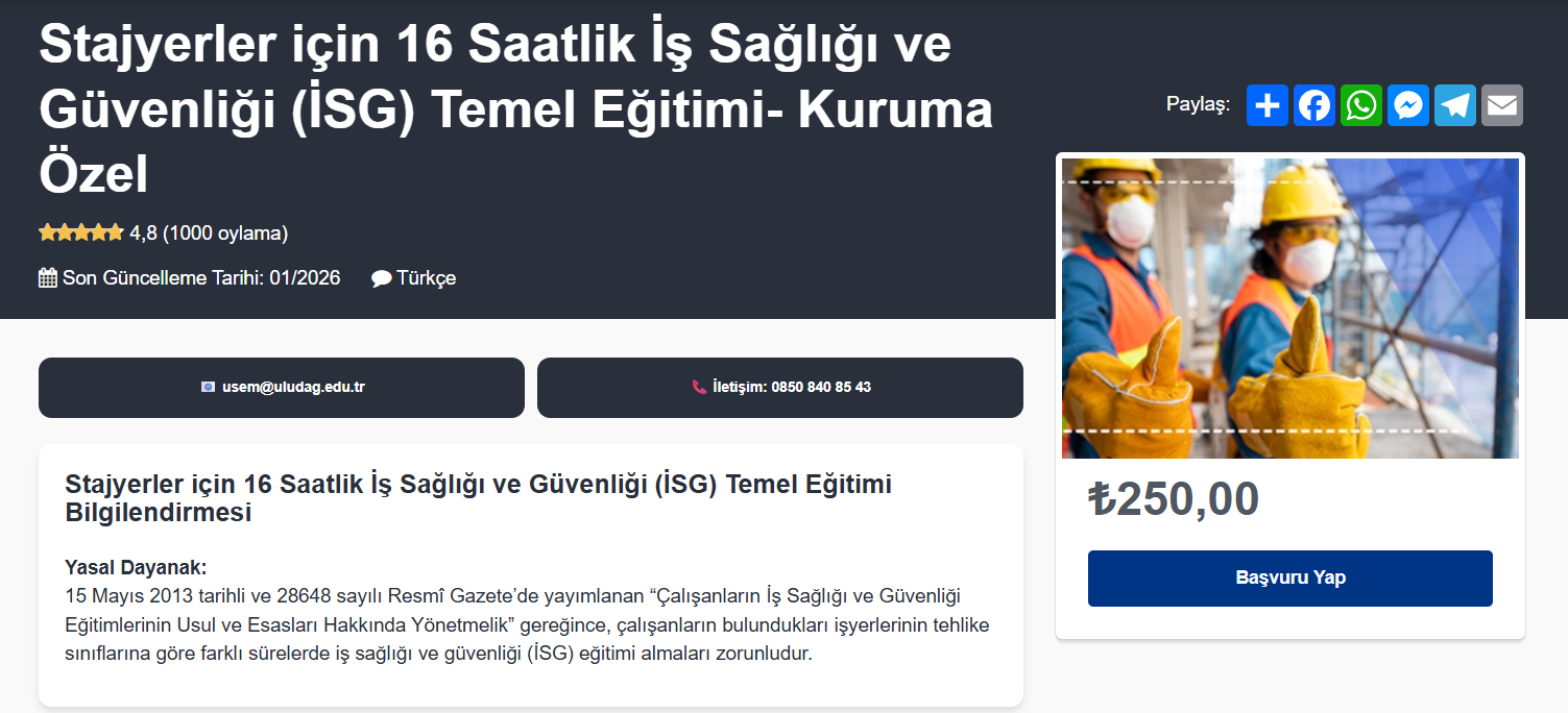 Stajyerler için 16 Saatlik İş Sağlığı ve Güvenliği (İSG) Temel Eğitimi Bilgilendirmesi