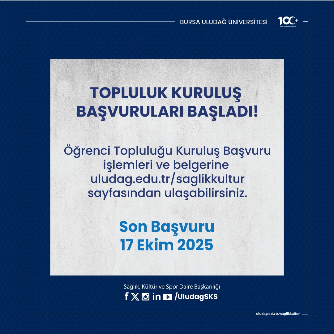 2025-2026 Eğitim-Öğretim yılında Öğrenci Topluluğu Kuruluş Başvuruları Kültür Müdürlüğü Öğrenci Toplulukları birimimize yapılmaktadır.