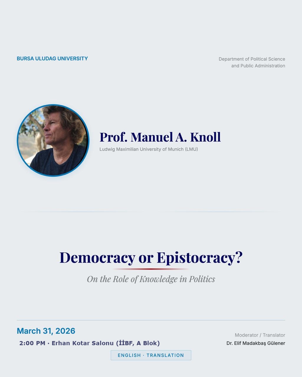 Bursa Uludağ Üniversitesi Siyaset Bilimi ve Kamu Yönetimi Bölümü olarak düzenlediğimiz Siyaset Felsefesi Konuşmaları kapsamında, Ludwig Maximilian Üniversitesi'nden (LMU) Prof. Manuel A. Knoll'u ağırlıyoruz.