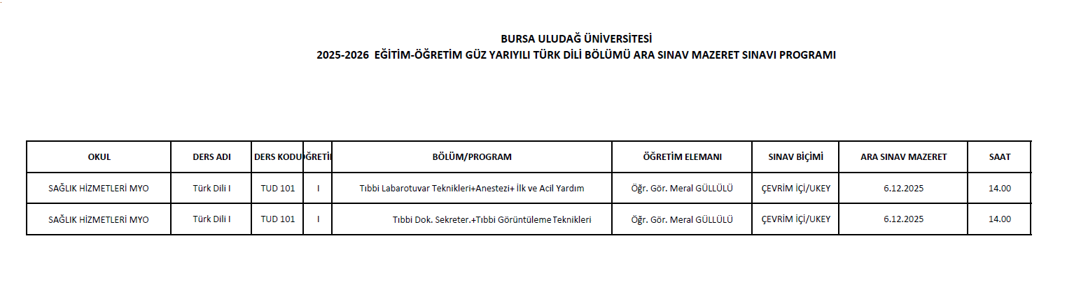 Türk Dili I Dersi Ara Mazeret Sınav Programı