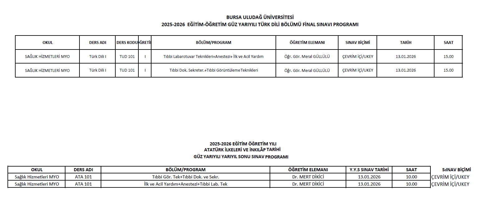 2025-2026 eğitim-öğretim yılı GÜZ yarıyılı TUD101 Türk Dili I ve ATA101 Atatürk İlkeleri ve İnkılâp Tarihi I dersleri Final Sınav programları altta sunulmuştur.