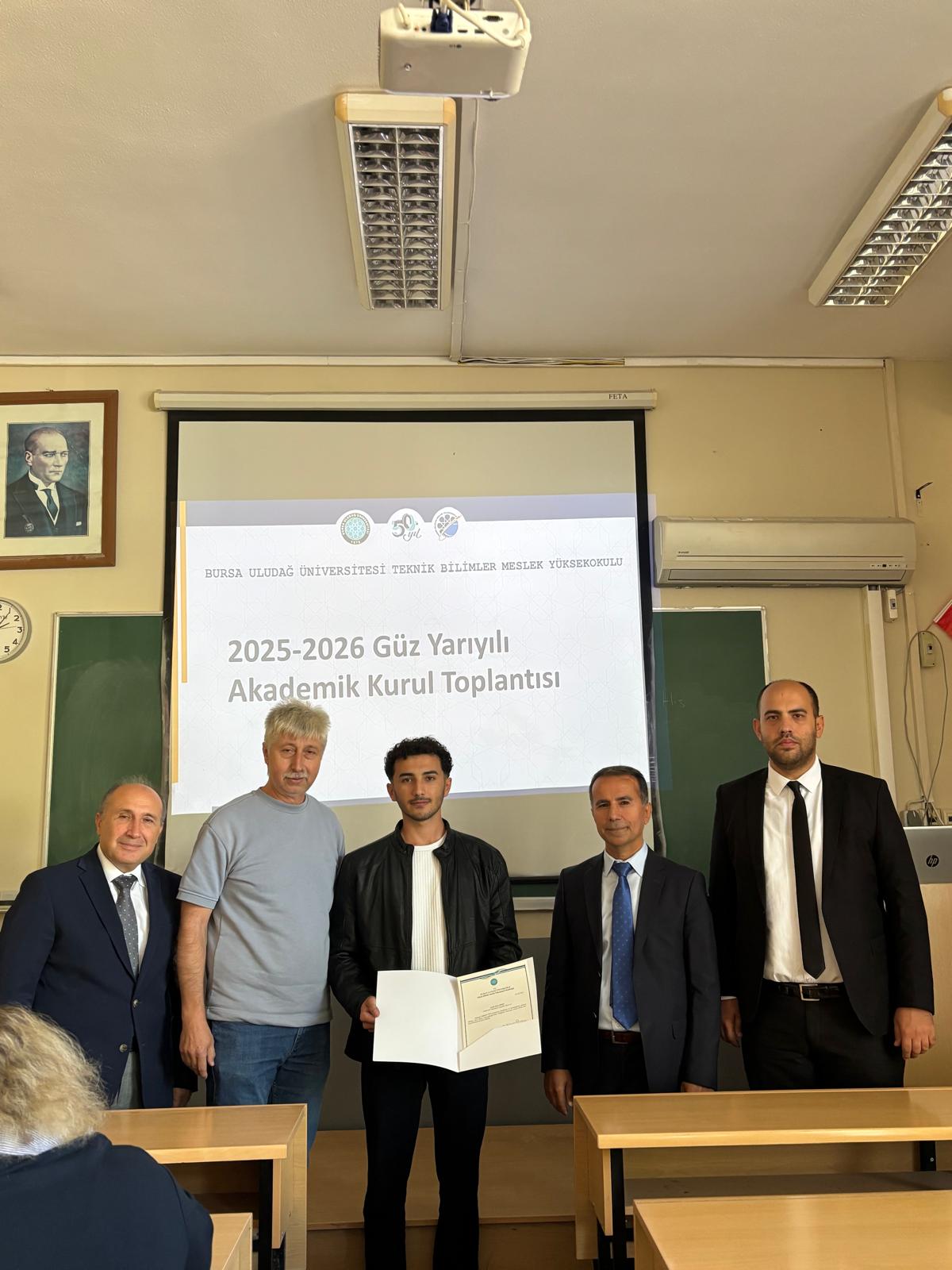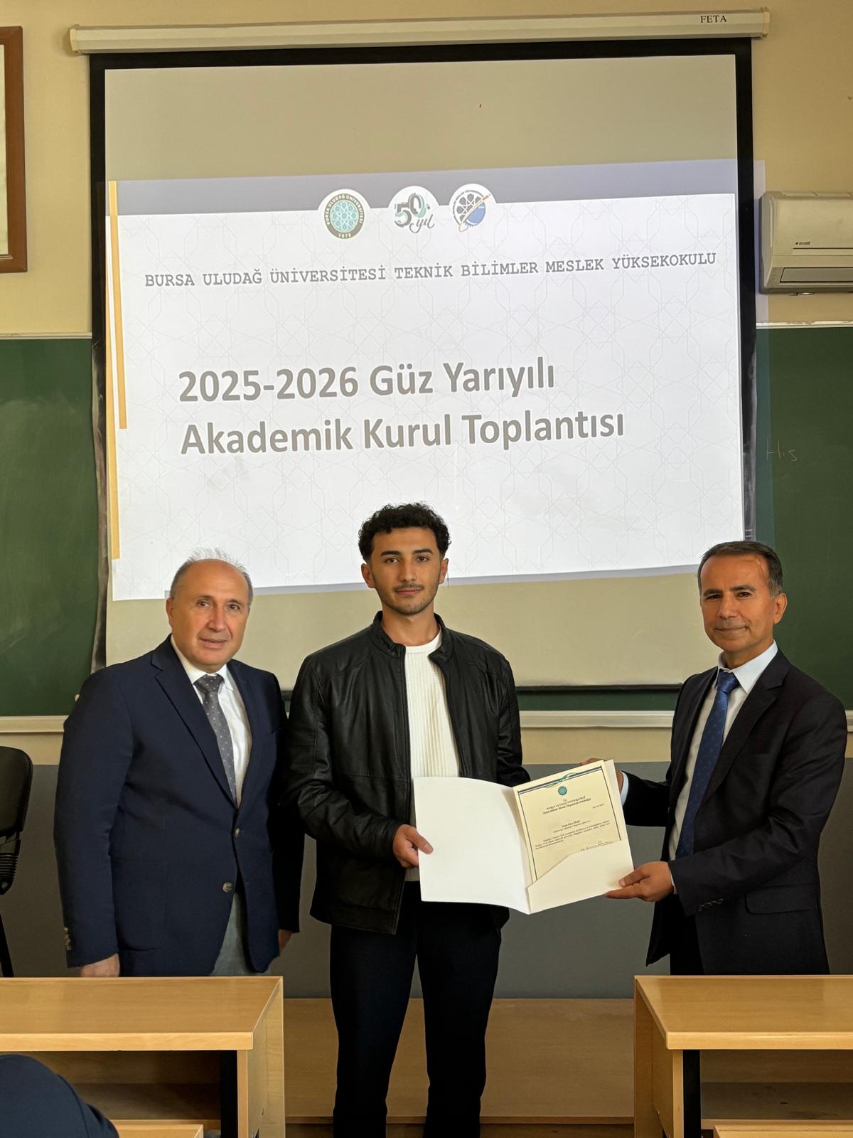 Teknofest’te bizi gururla temsil ederek dereceye giren öğrencimize Yüksekokul Müdürümüz Prof. Dr. Mehmet KARAHAN tarafından teşekkür belgesi takdim edildi.