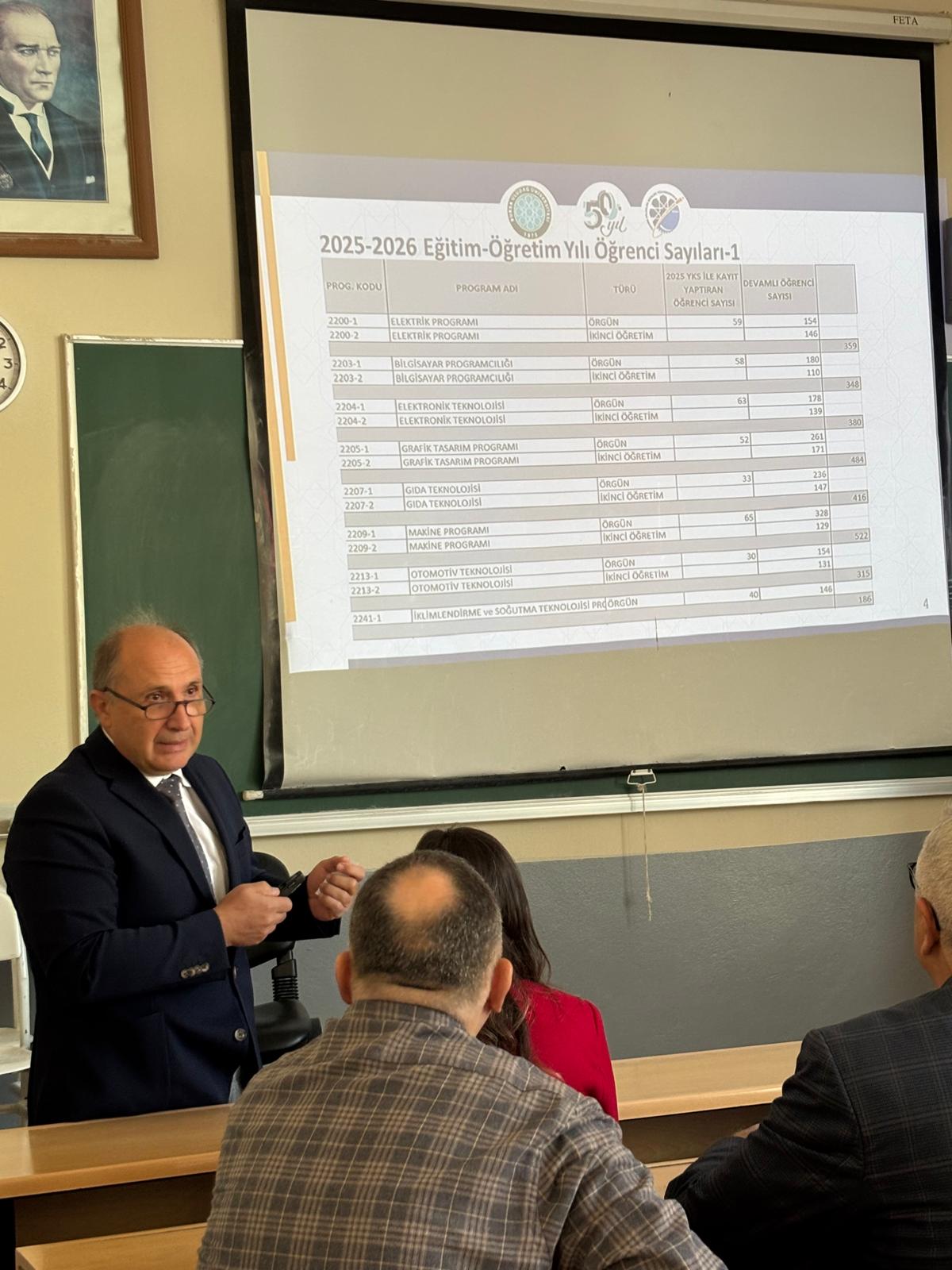 Akademik Kurul toplantısında Müdür Yardımcımız Doç.Dr. Mesut Ertan GÜNEŞ tarafından, anket çalışmalarının ön değerlendirilmesi, 2025-2026 güz döneminde yapılması planlanan faaliyetler ve eğitim- öğretim planları ile Makine programımızın MEDEK akreditasyonu hakkında bilgiler verildi.
