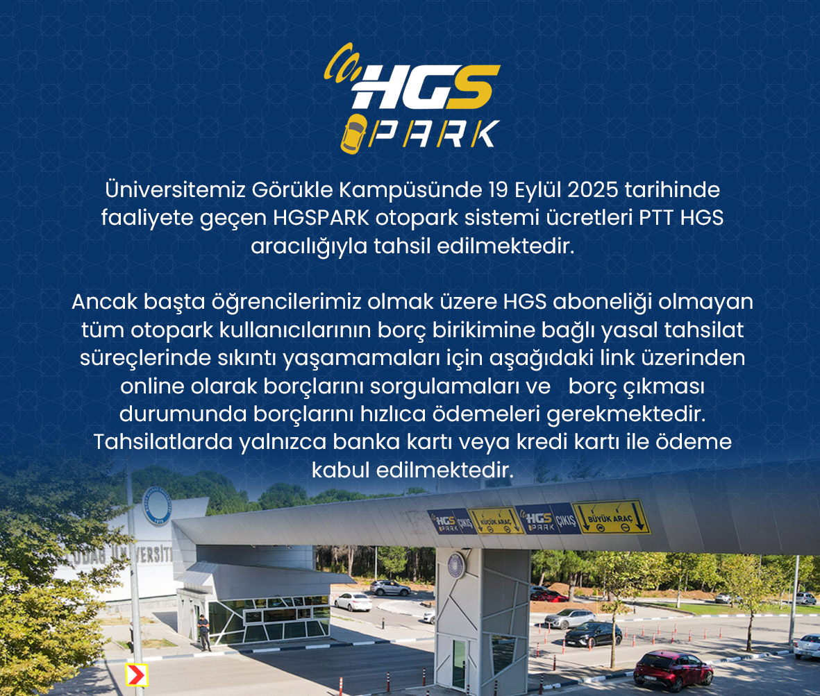 PTT HGS PARK sistemi ile Üniversitemiz Görükle Kampüsü’nde bulunan otoparklar ücretli hale getirilecektir. Sistem 19 Eylül 2025 Cuma günü saat 00.00’da devreye girmiştir. Üniversitemiz mensuplarının, öğrencilerimizin, Üniversitemizde faaliyet gösteren ticari işletmelerin ve Üniversitemizde görev yapan diğer kamu kurumu personellerinin mağduriyet yaşamaması için aşağıdaki kurallar çerçevesinde hareket etmeleri gerekmektedir.