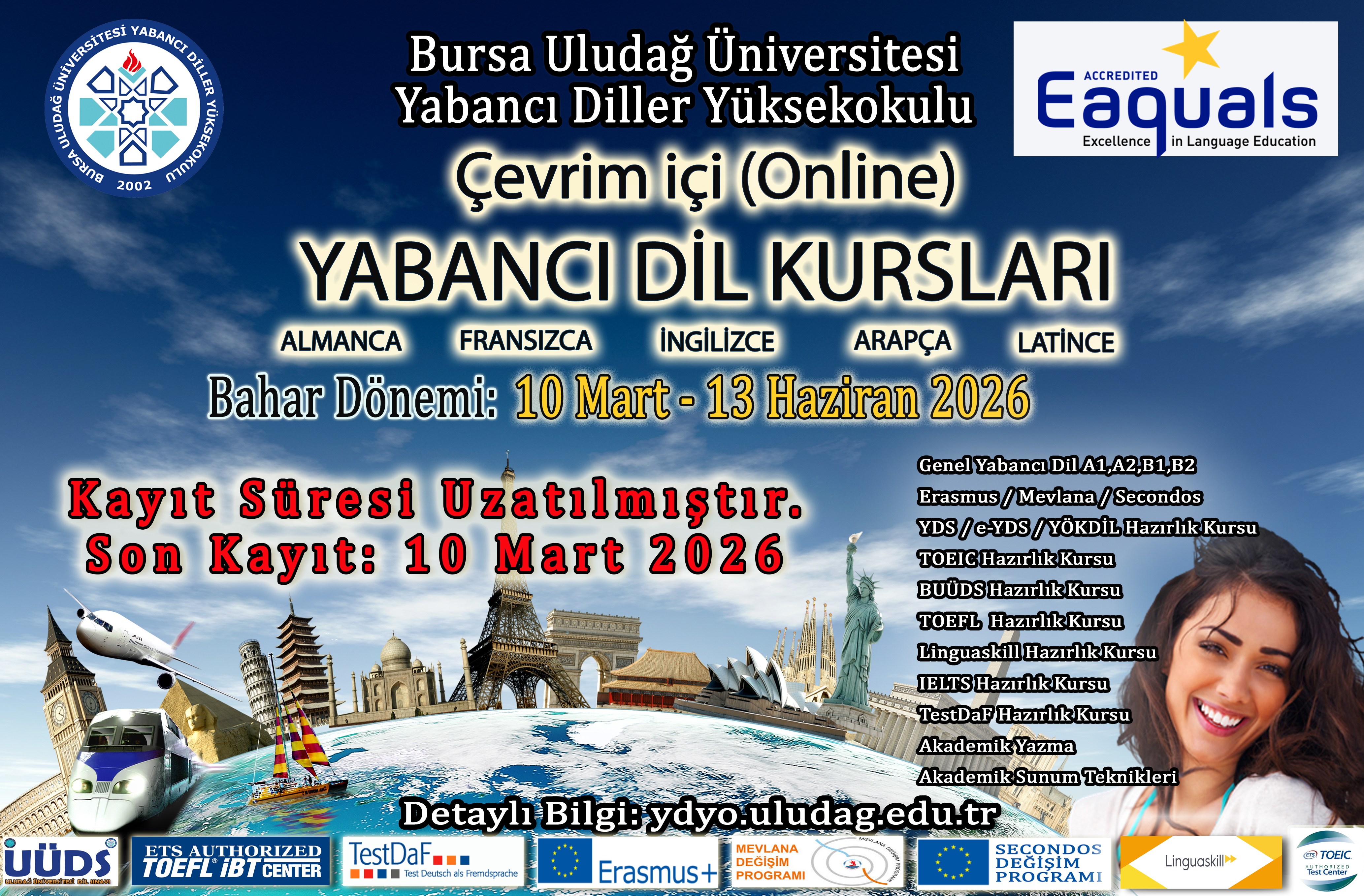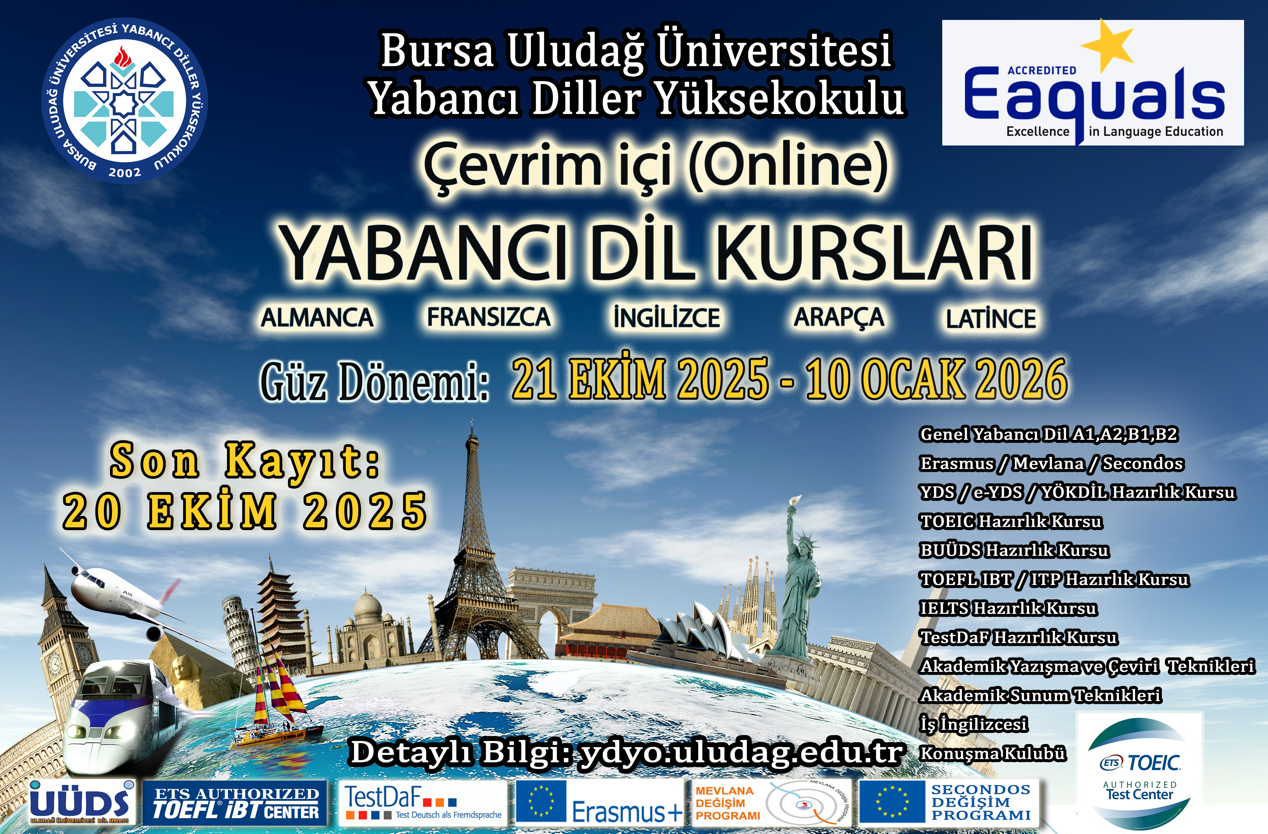 Kayıt işlemlerini gerçekleştirmeden önce aşağıdaki Yabancı Dil Kurs Bilgilendirmesi ile Kurs ücretlerini dikkatlice okuyunuz. Sorularınız için ogrenciydyo@uludag.edu.tr adresine mail atabilir, 0 224 294 26 56 nolu telefondan Öğrenci İşlerine bağlanabilirsiniz.