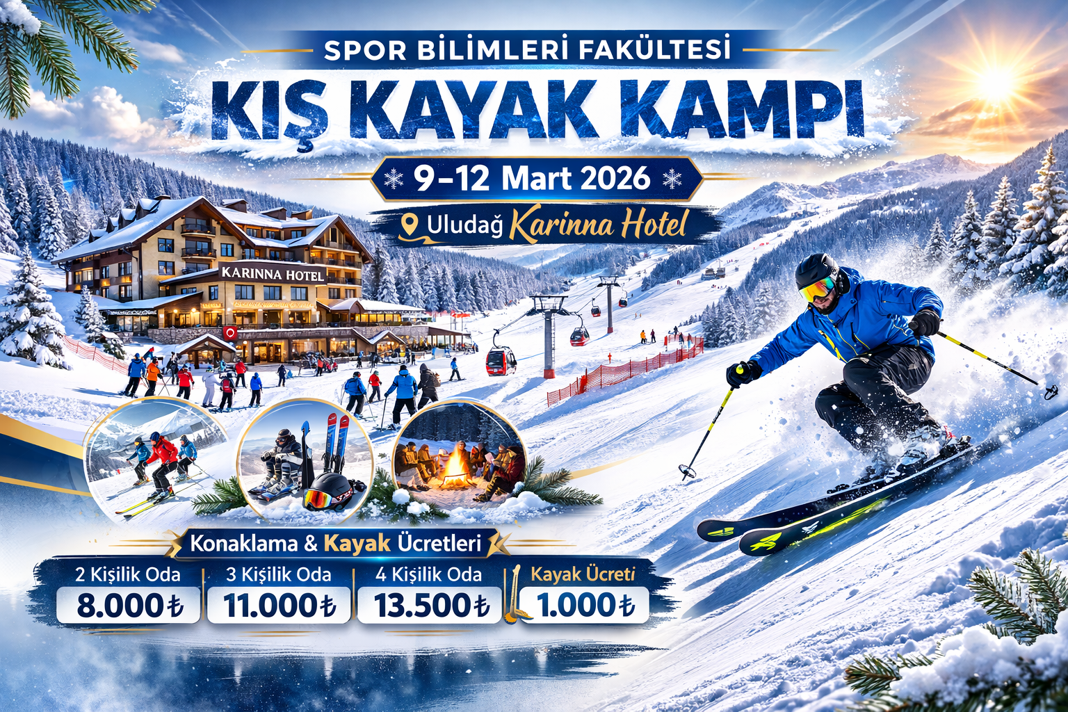 Spor Bilimleri Fakültesi tarafından 9–12 Mart 2026 tarihlerinde Uludağ Karinna Hotel ev sahipliğinde gerçekleştirilecek olan Kış Kayak Kampına yönelik bilgilendirme toplantısı, 6 Mart Cuma günü saat 14.00’te fakültemiz 301 numaralı dersliğinde yapılacaktır.