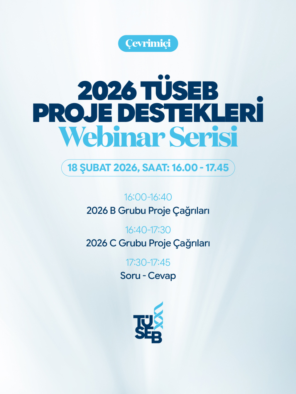 Türkiye Sağlık Enstitüleri Başkanlığı (TÜSEB) tarafından düzenlenen 2026 Yılı TÜSEB Proje Destekleri Webinar Eğitimi, 18 Şubat 2026 tarihinde gerçekleştirilecektir.