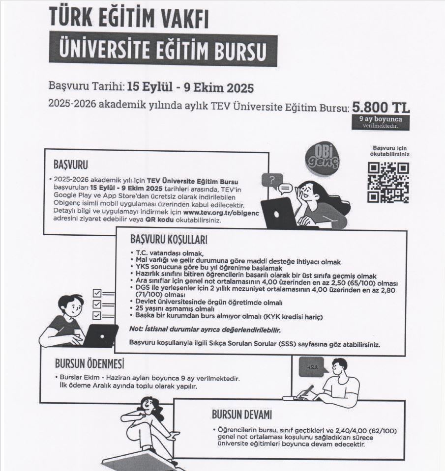verilecek burs için başvurular, 15 Eylül – 9 Ekim 2025 tarihleri arasında TEV’in dijital