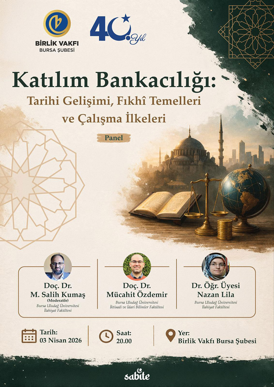 BUİMER Müdürü Doç. Dr. Mücahit Özdemir, YK üyeleri Doç. Dr. M. Salih Kumaş ve Dr. Öğr. Üyesi Nazan Lila'nın katılımıyla gerçekleşen program, İslam iktisadı ve finansı alanında güncel tartışmaları derinleştirmeyi hedefledi. Birlik Vakfı Bursa Şubesi ev sahipliğinde düzenlenen panelin moderatörlüğünü Doç. Dr. M. Salih Kumaş üstlenirken, konuşmacı olarak Doç. Dr. Mücahit Özdemir ve Dr. Öğr. Üyesi Nazan Lila yer aldı.