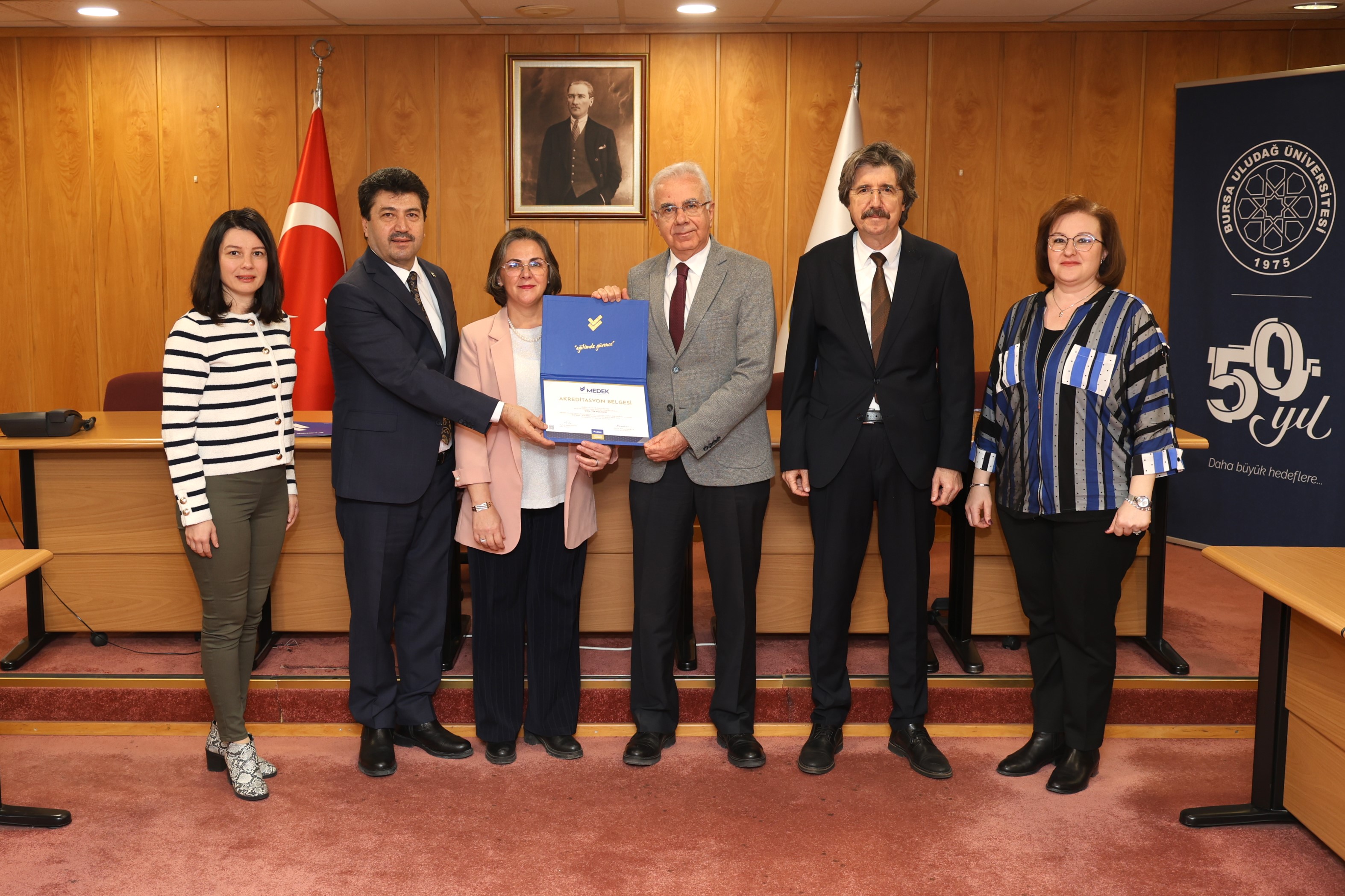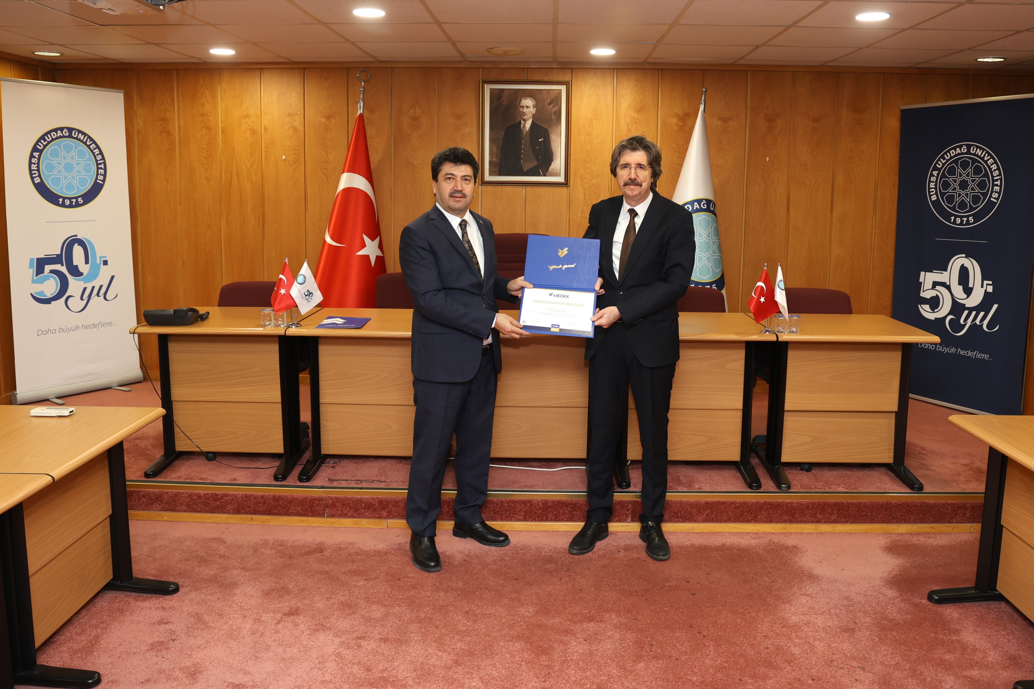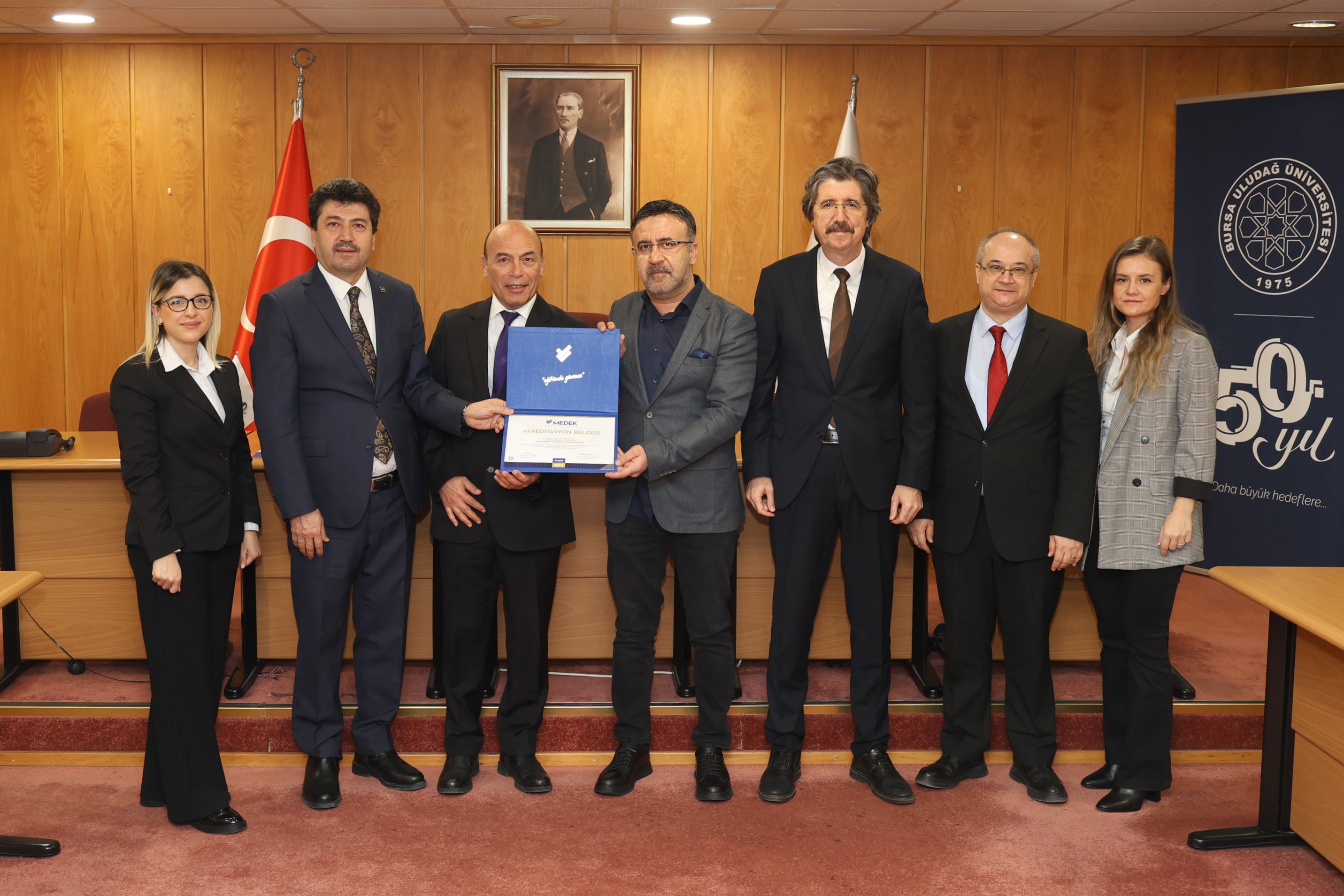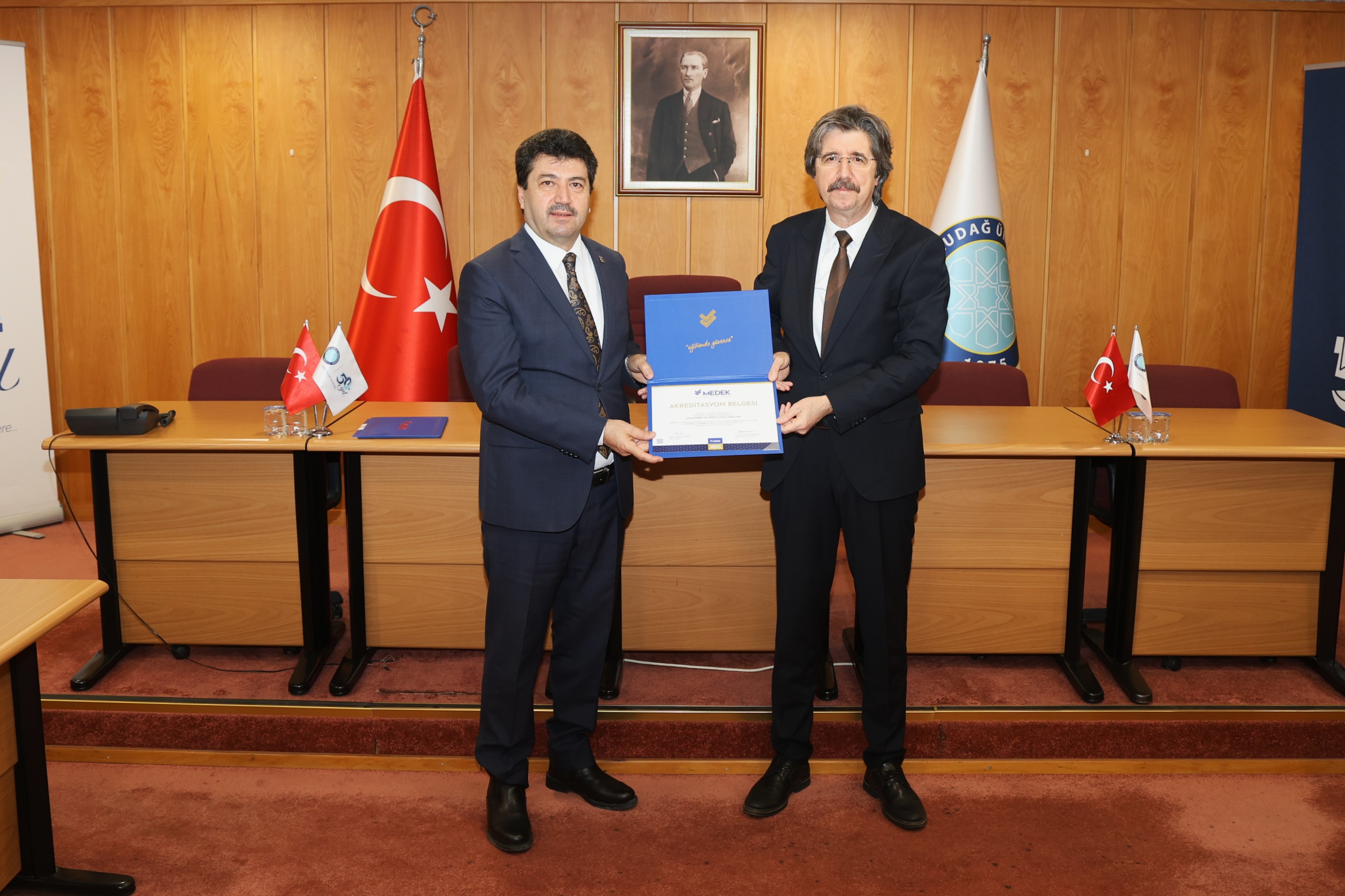 Programda kısa bir konuşma yapan BUÜ Rektörü Prof. Dr. Ferudun Yılmaz, “Bir araştırma üniversitesi olarak akreditasyon süreçlerini çok önemsiyoruz. Fakülteler bazında Mühendislik Fakültemiz başta olmak üzere Ziraat Mühendisliğimiz ve Fen-Edebiyat Fakültemiz de hızlı bir akreditasyon sürecine girdi. Tıp Fakültemizin akreditasyon tecrübesi son derece eski. Veteriner Fakültemizin hem ulusal hem Avrupa Birliği akreditasyon dereceleri var. Buradaki akredite olan program sayısını arttırmaya çalışıyoruz. Şimdi MEDEK vasıtası ile sürecin meslek yüksekokullarına doğru yayılıyor olması zaten bu kültüre sahip olan bir üniversite olarak bizlerin de hemen harekete geçmesine sebep oldu. Süreç içerisinde emeği bulunan ve fedakârca çalışmalara katılan tüm yöneticilerimize, hocalarımıza ve personelimize gönülden teşekkür ediyorum. Yeni akreditasyon belgelerimizin herkese örnek olmasını diliyor, sayısının artmasını umut ediyorum” şeklinde konuştu.