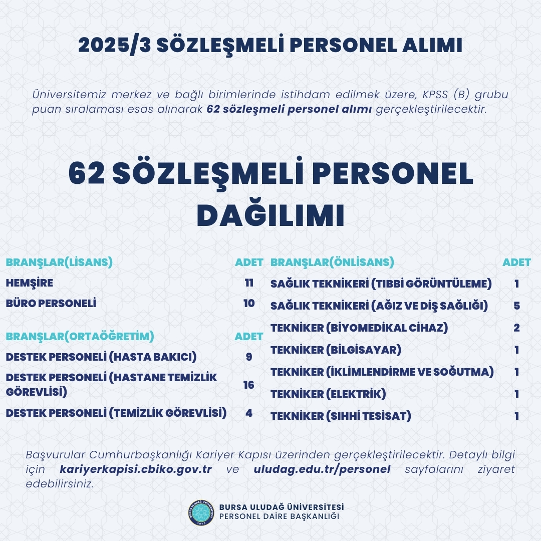 Alıma ilişkin tüm duyurular https://www.uludag.edu.tr/ ve https://uludag.edu.tr/personel/ internet adreslerinden yayımlanacaktır. Ayrıca adaylar başvurularına ilişkin tüm bilgilere Kariyer Kapısı Platformu üzerinden de ulaşabileceklerdir.