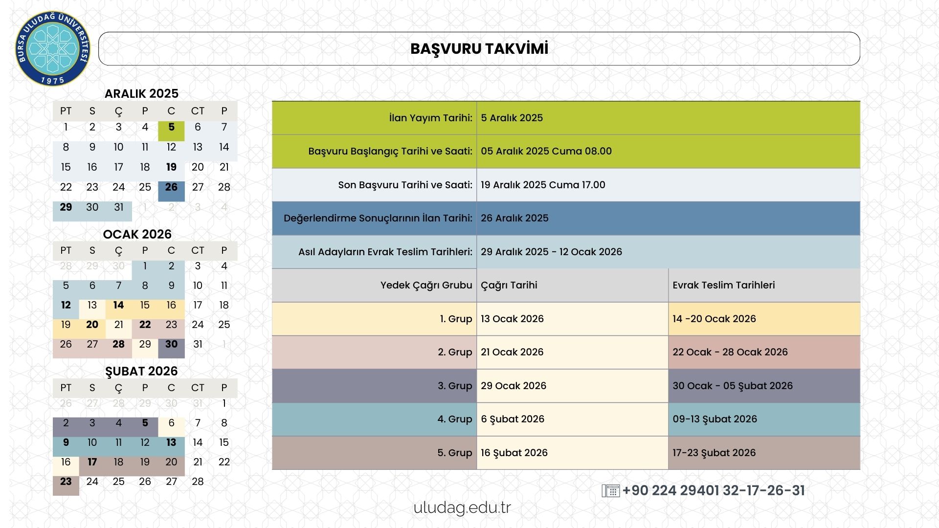 Başvurular e-Devlet Kapısı üzerinden "Bursa Uludağ Üniversitesi-Kariyer Kapısı Kamu İşe Alım" hizmeti veya "Kariyer Kapısı" (https://kariyerkapisi.gov.tr/isealim) internet adresi üzerinden çevrimiçi olarak yapılacaktır. 05 Aralık 2025 Cuma günü mesai başlangıç saati itibarıyla (08.00) başlayacak olan başvurular 19 Aralık 2025 Cuma günü mesai bitimiyle (17.00) tamamlanacaktır. Söz konusu uygulama dışında şahsen, posta veya diğer yollarla yapılan hiçbir başvuru değerlendirmeye alınmayacaktır.