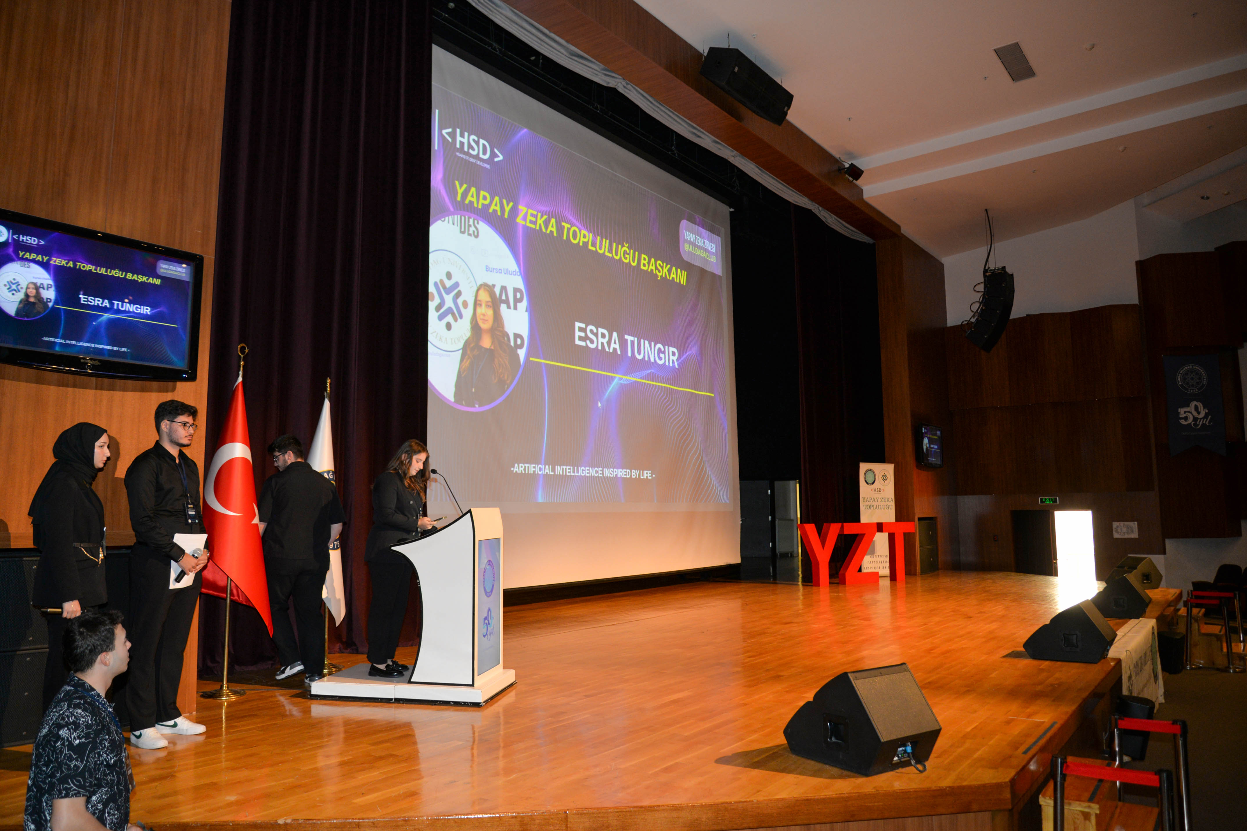 Konuşmasında bir arada olmaktan mutluluk duyduğunu belirten BUÜ Yapay Zekâ Topluluğu Başkanı Esra Tungır ise yapay zekânın hayattan ilham aldığına işaret etti. Topluluk olarak öğrenmenin, üretmenin ve paylaşmanın gücüyle büyüdüklerini aktaran Tungır; “Topluluğumuz sadece yapay zekâ alanında çalışan değil, bu alanda gelişmek isteyen herkese dokunan bir ekosistem haline geldi. Ulusal ve uluslararası yarışmalarda çok sayıda başarı elde ettik. Bugün yaptığımız organizasyonda da 40'tan fazla üniversite ile 7 liseden yüzlerce genci bir araya getirmenin haklı gururunu yaşıyoruz” diye konuştu.
