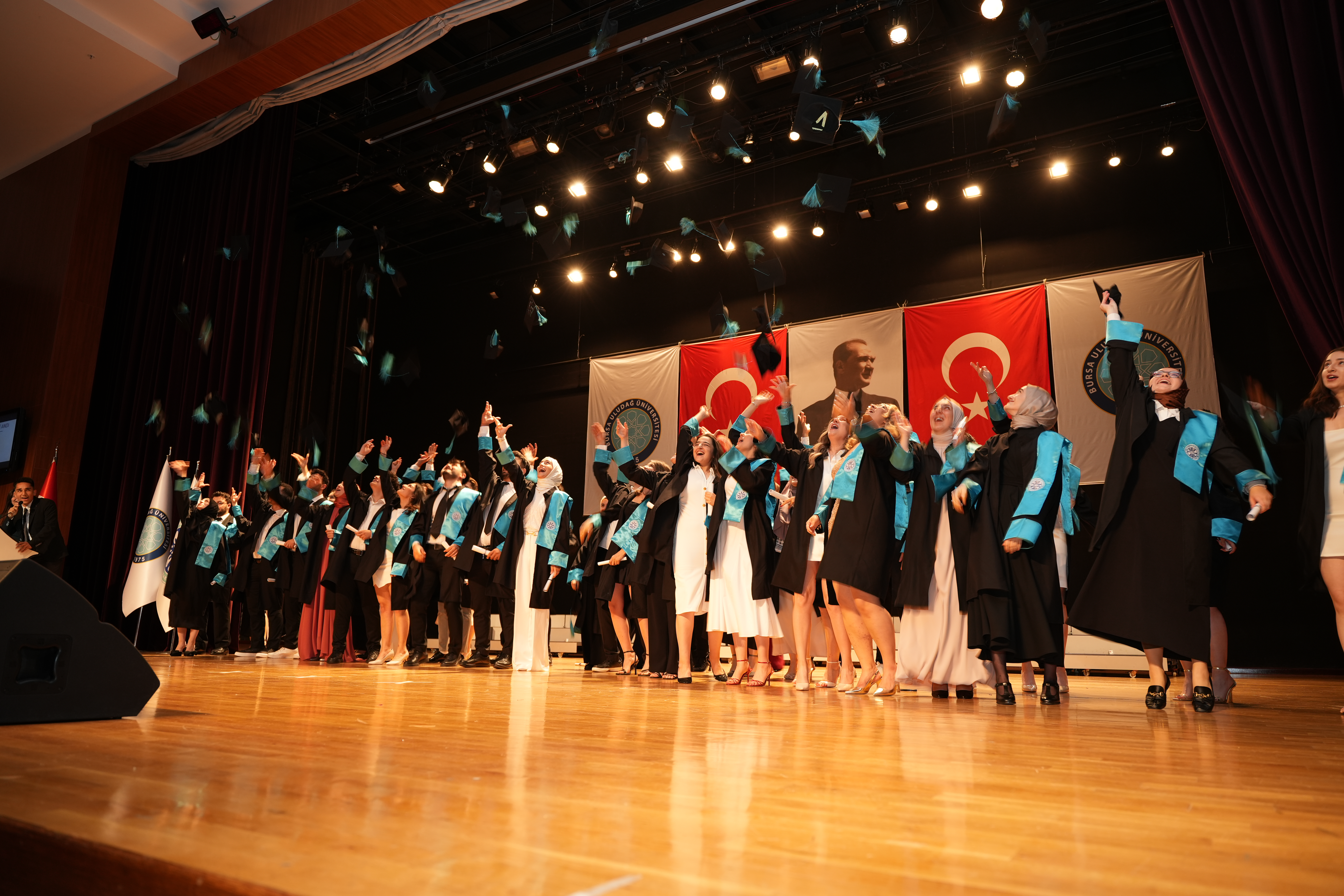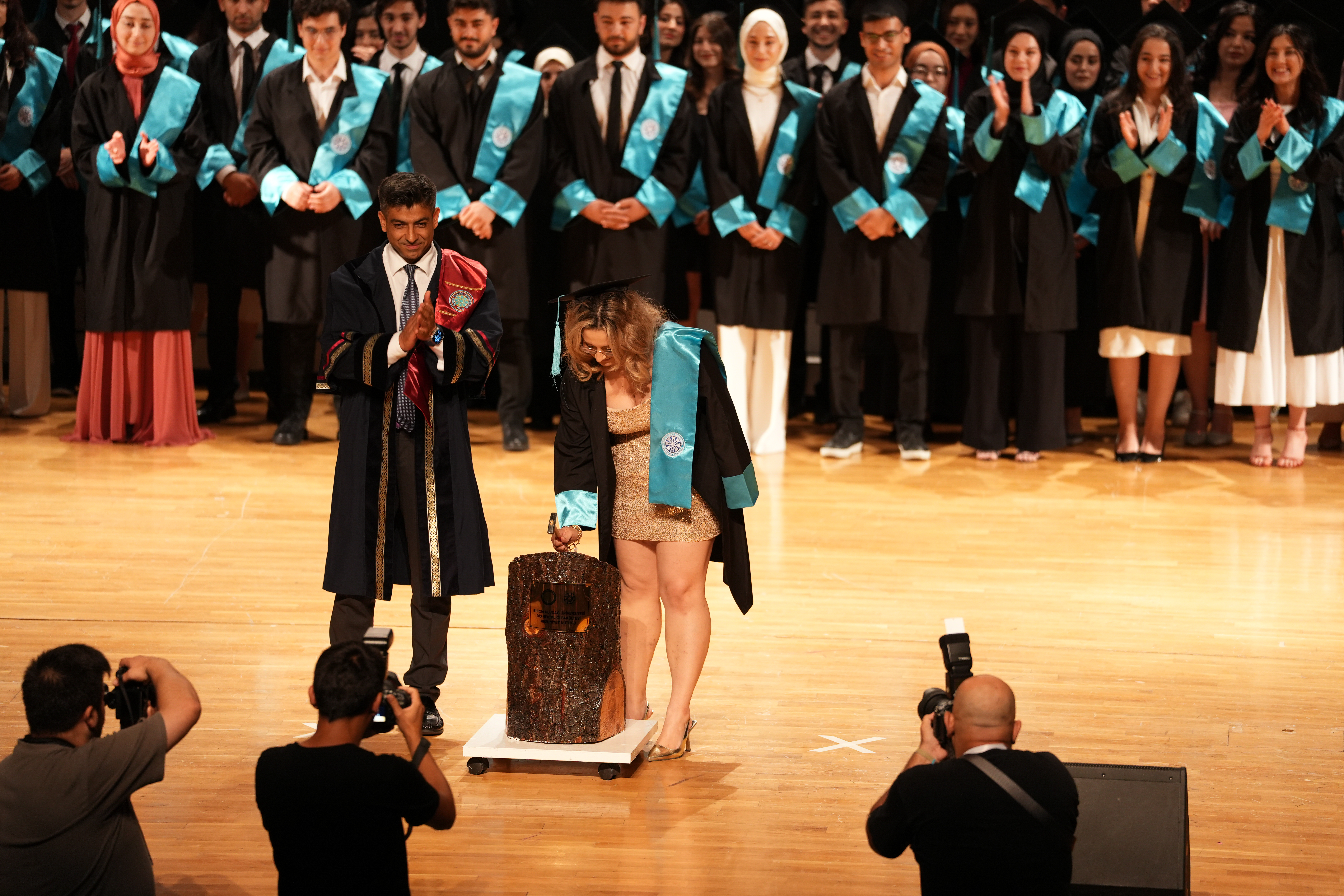 Öğrencilere mezuniyet anı belgelerinin takdimi ve mezuniyet andının okunmasının ardından öğrenciler keplerini coşkuyla havaya fırlatarak bu tarihi günü büyük bir gurur ve coşkuyla taçlandırdı.