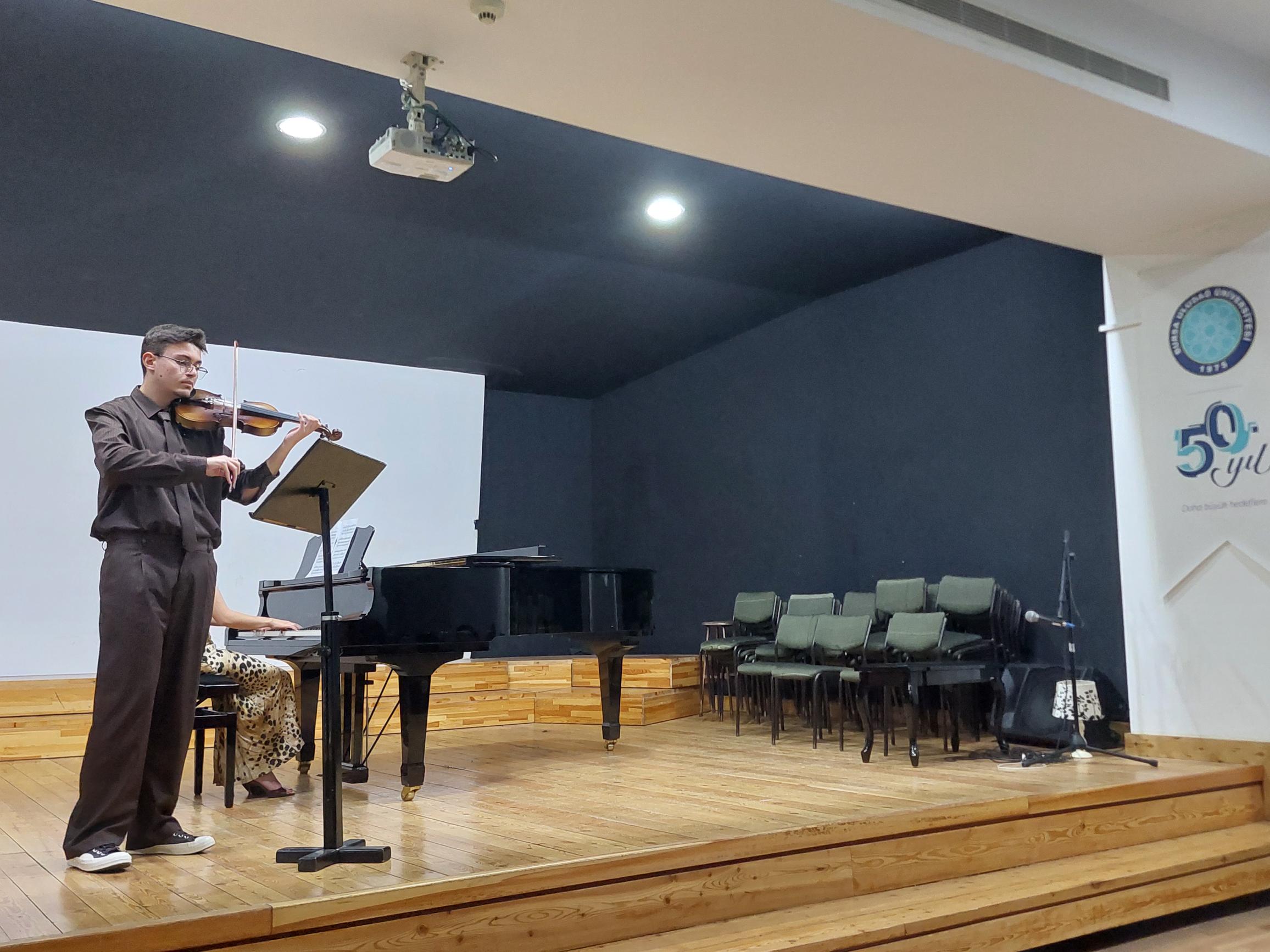 During the concert, students of the Department of Music Education performed works from various musical periods and composers as part of a program they had prepared. The solo and accompanied performances received great appreciation from the audience. The event was also attended by the Vice Dean of the Faculty of Education and Head of the Division of Fine Arts Education, Prof. Dr. Rasim Erol Demirbatır, who congratulated the students on stage for their efforts and performances.