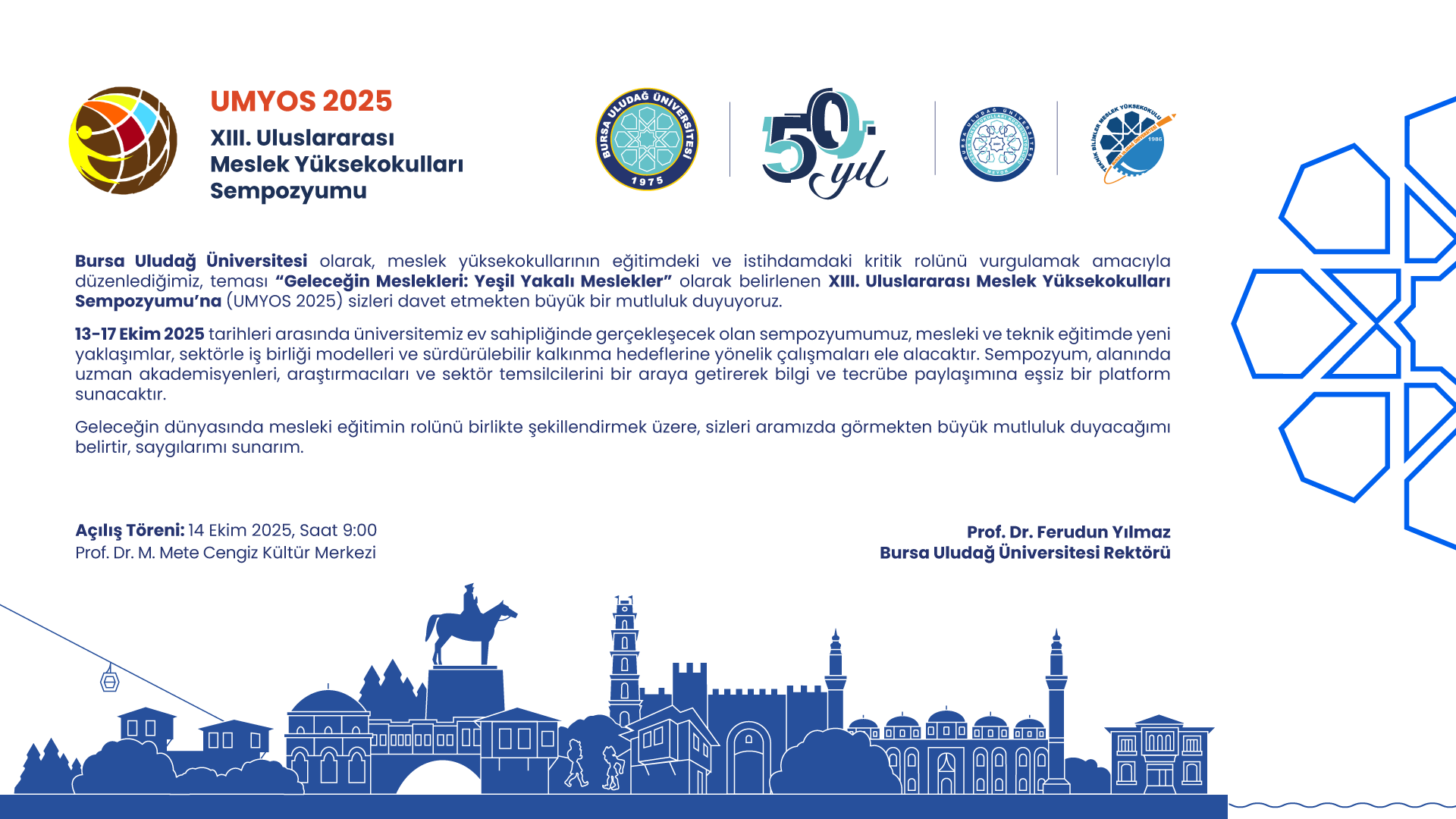 We invite you to the XIIIth International Vocational Schools Symposium (UMYOS 2025), hosted by Bursa Uludağ University from October 13-17, 2025. The symposium will take place at the Bursa Uludağ University Prof. Dr. Mete Cengiz Cultural Center.