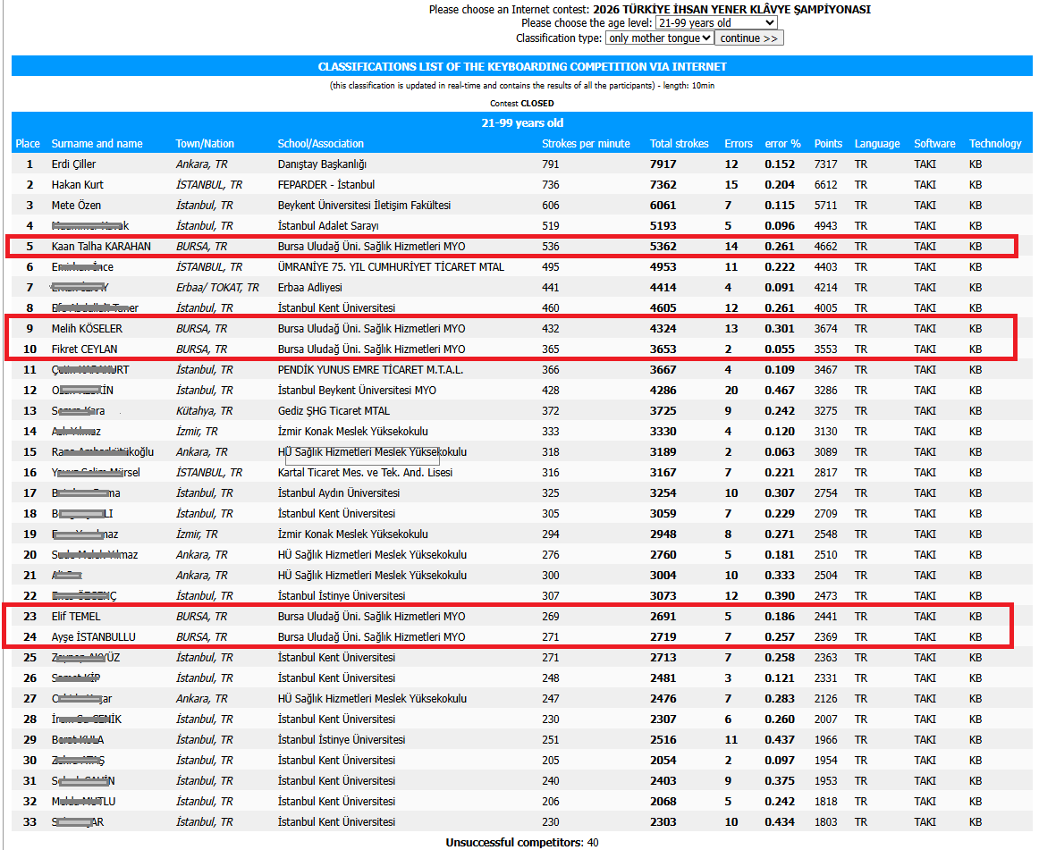 Our participants from the Medical Documentation and Secretarial Skills program at our Vocational School competed in two separate age categories—the 17–20 age group (2 participants) and the 21–99 age group (5 participants)—in a 10-minute typing speed test conducted in Turkish. The scores and rankings of our participants are as follows: