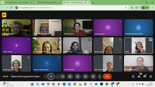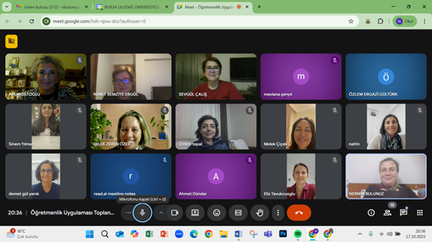 17.10.2025 Çarşamba günü “2025-2026 Güz Dönemi Fen Bilgisi Eğitimi Anabilim Dalı Öğretmenlik Uygulaması Bilgilendirme Toplantısı” çevrim içi olarak gerçekleştirilmiştir. Toplantıya, Anabilim Dalı Başkanımız Prof. Dr. Nermin Bulunuz,  Anabilim dalımız Uygulama Okulları Koordinatörleri Doç. Dr. Sevgül Çalış ve Arş. Gör. H. Azize Malay, 2025 Bahar döneminde Fen Bilgisi Eğitimi Anabilim Dalında Öğretmenlik Uygulaması dersi veren öğretim üyelerimiz Prof. Dr. Remziye Ergül, Doç. Dr. Dilek Zeren Özer ve okullarda öğretmen adaylarımızdan sorumlu uygulama öğretmenleri katılmıştır.