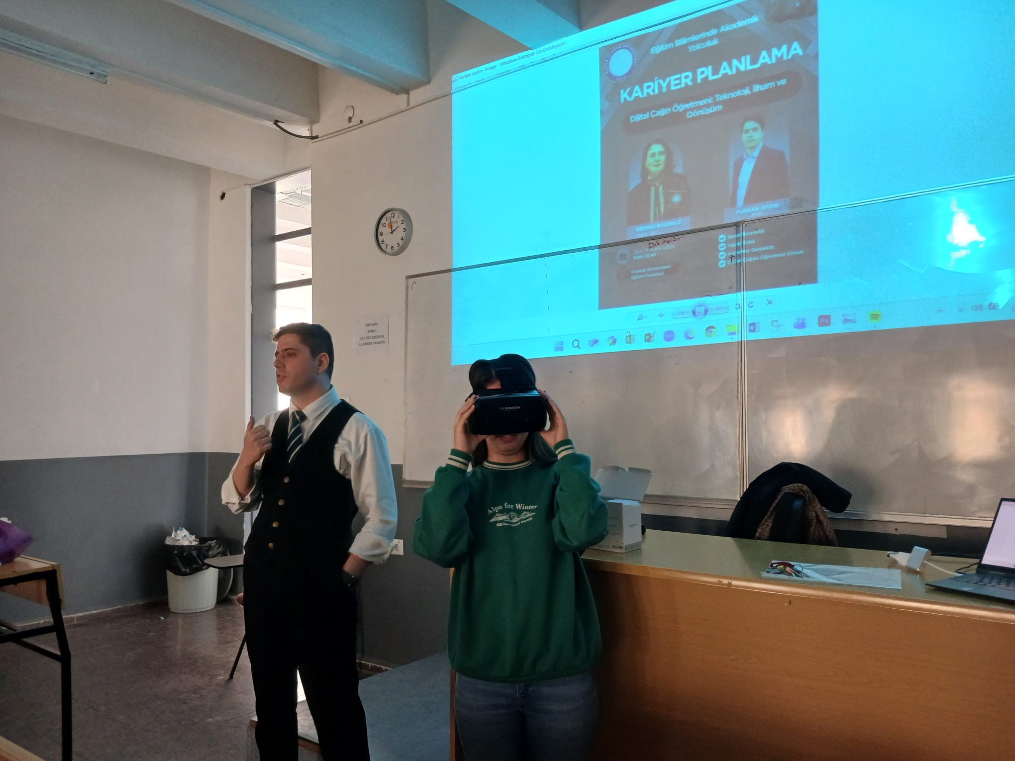 Vermiş olduğu “Dijital çağın öğretmeni: Teknoloji, ilham ve dönüşüm” adlı seminerde Furkan Aydın, sanal gerçeklik, yapay zekâ, artırılmış gerçeklik ve dijital çağda öğretmen olmak gibi konularda öğrenciler ile bilgi paylaşımında bulunmuştur. Furkan Aydın seminerde yanında getirdiği VR gözlüğü tanıtmış, isteyen öğrenciler bu gözlüğü takarak deneyimleme fırsatı elde etmişlerdir. Ek olarak, özel bir okulda öğretmen olmak ile ilgili de kişisel deneyimlerini de paylaşan Furkan Aydın seminer sonunda öğrencilerden gelen soruları da cevaplandırmıştır. Seminer teşekkür ve çiçek takdimi ile son bulmuştur. Sevgili Furkan Aydın’a fakültemizi yeni kazanan öğrencilerimize ayırmış olduğu değerli zamanı ve vermiş olduğu bilgilerden ötürü çok teşekkür ederiz.