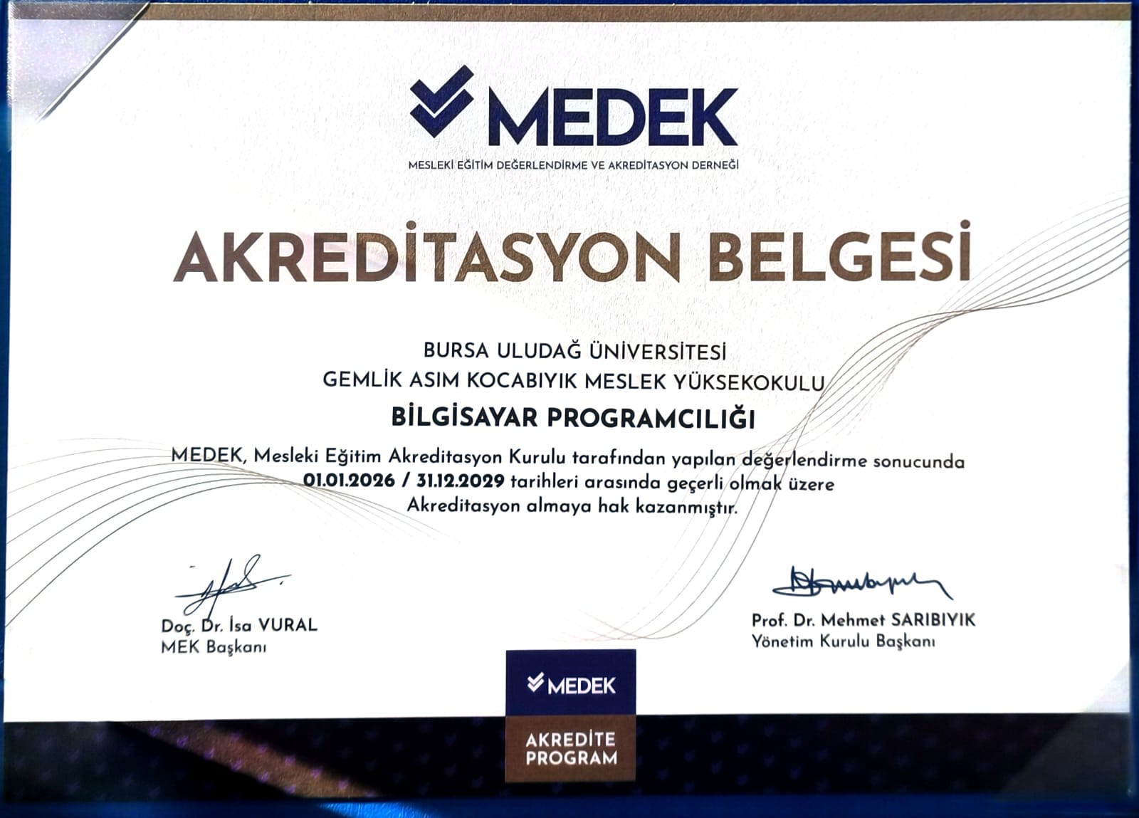 Bursa Uludağ Üniversitesi Gemlik Asım Kocabıyık Meslek Yüksekokulu bünyesinde faaliyet gösteren Bilgisayar Programcılığı Programı, Mesleki Eğitim Değerlendirme ve Akreditasyon Derneği (MEDEK) tarafından yürütülen değerlendirme sürecini başarıyla tamamlayarak 01.01.2026 – 31.12.2029 tarihleri arasında 4 yıl süreyle Tam Akreditasyon almaya hak kazandı.