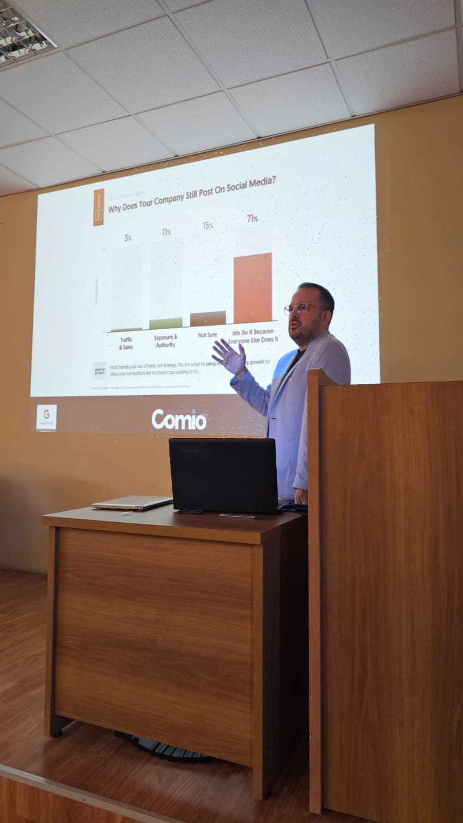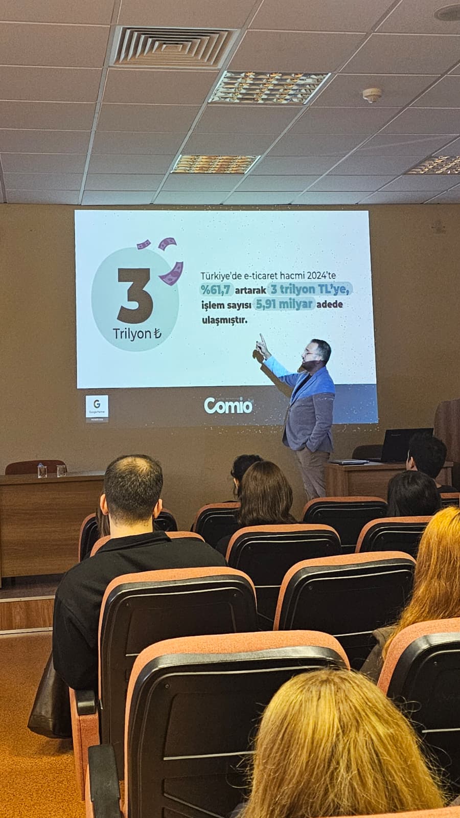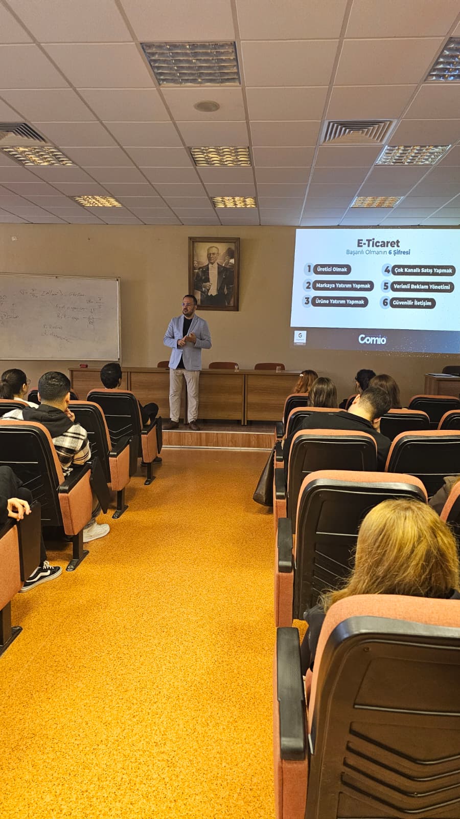 Seminere, Comio Dijital Pazarlama A.Ş. Kurucu Ortağı Mustafa Sönmezay konuşmacı olarak katıldı. Sönmezay sunumunda, dijital pazarlamanın temel dinamikleri, e-ticaret süreçlerinin işletmelere sağladığı avantajlar ve sektördeki güncel gelişmeler üzerine kapsamlı bilgiler aktardı. Ayrıca, dijital platformlarda marka yönetimi, müşteri deneyimi oluşturma ve çevrimiçi satışta başarıya ulaşmanın yolları üzerinde durdu. Girişimcilik konusuna da özel bir vurgu yaparak, öğrencileri kendi iş fikirlerini geliştirmeye ve dijital pazarda yenilikçi düşünmeye teşvik etti. Etkinlik sonunda öğrenciler, e-ticaretin geleceği ve dijital dönüşüm sürecine dair sorularını yönelterek interaktif bir oturum gerçekleştirdiler.