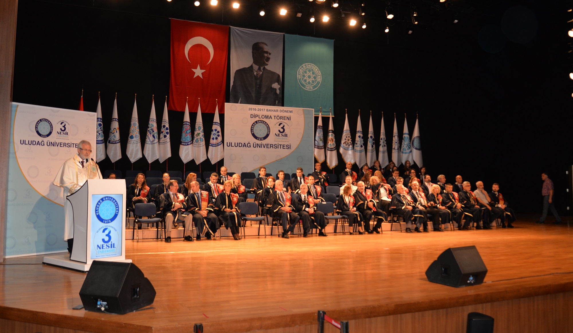 Uludag Üniversitesi’nde diploma törenlerinin coskusu yasanmaya devam ediyor. Mezun olan ögrencilerin gerçek diplomalarina kavustuklari törenler Iktisadi ve Idari Bilimler Fakültesi ve Sosyal Bilimler Enstitüsü ile sürdü. UÜ Rektörü Prof. Dr. Yusuf Ulcay, Rektör Yardimcilari Prof. Dr. Eray Alper ve Prof. Dr. Mehmet Yüce, IIBF Dekani Prof. Dr. Tayyar Ari, Sosyal Bilimler Enstitüsü Müdürü Prof. Dr. Filiz Giray, fakülte yöneticileri, akademisyenler, ögrenciler ve aileleri törenlerde hazir bulundu.