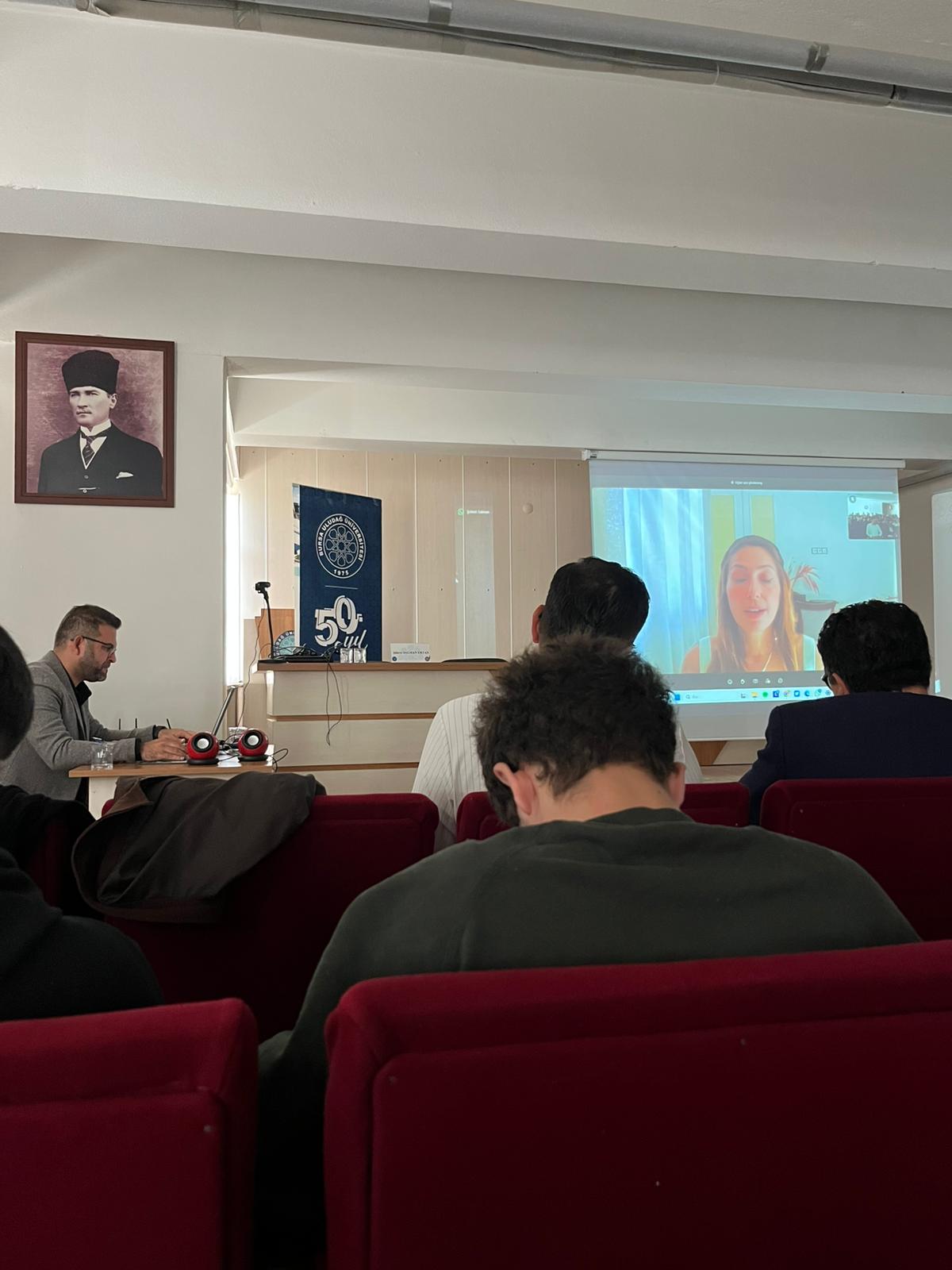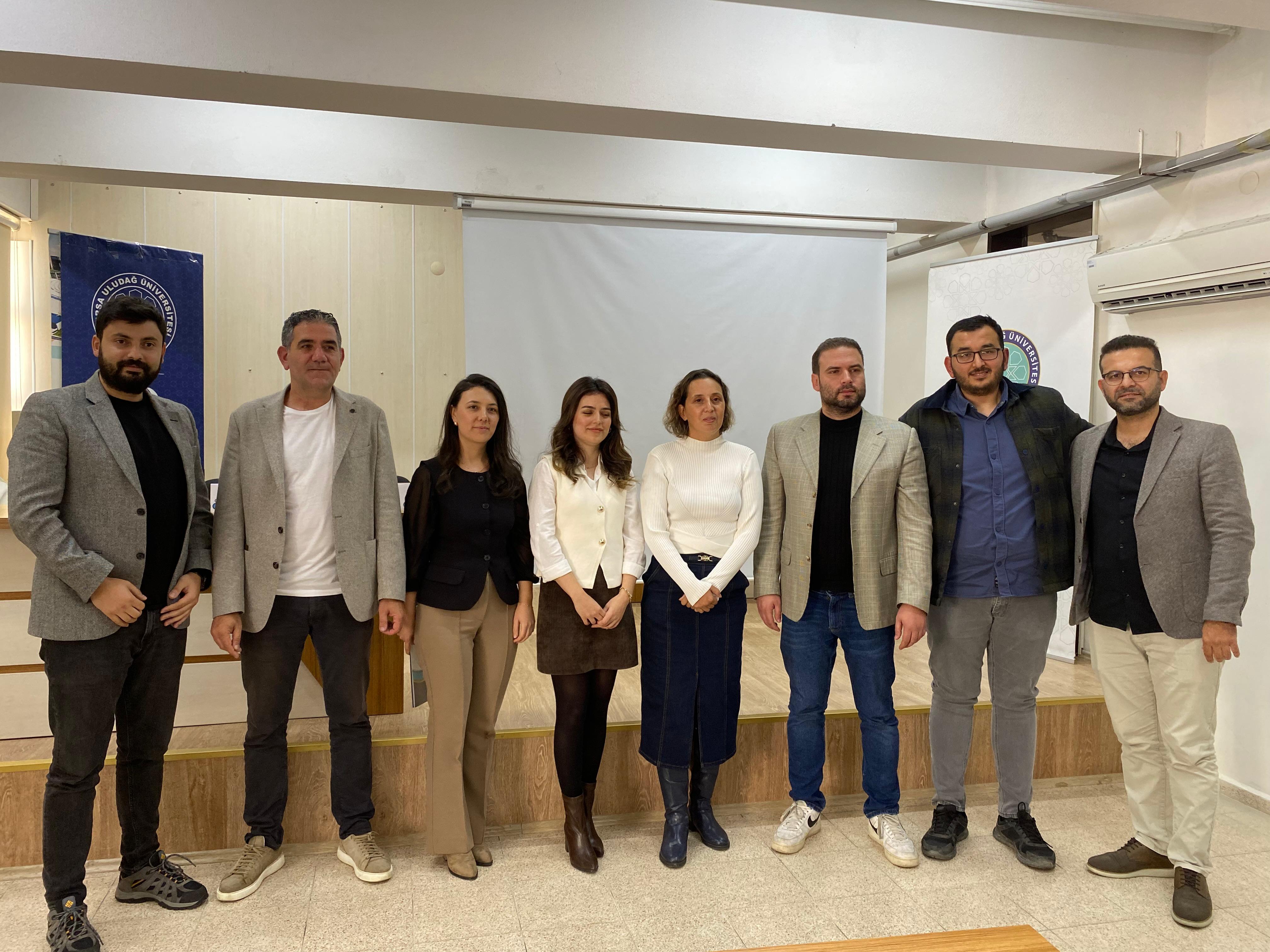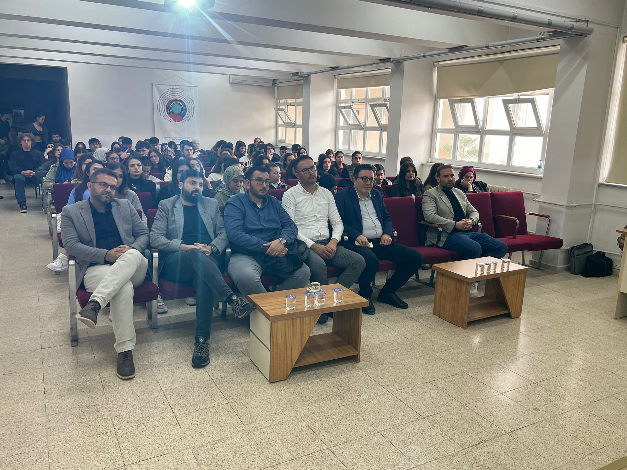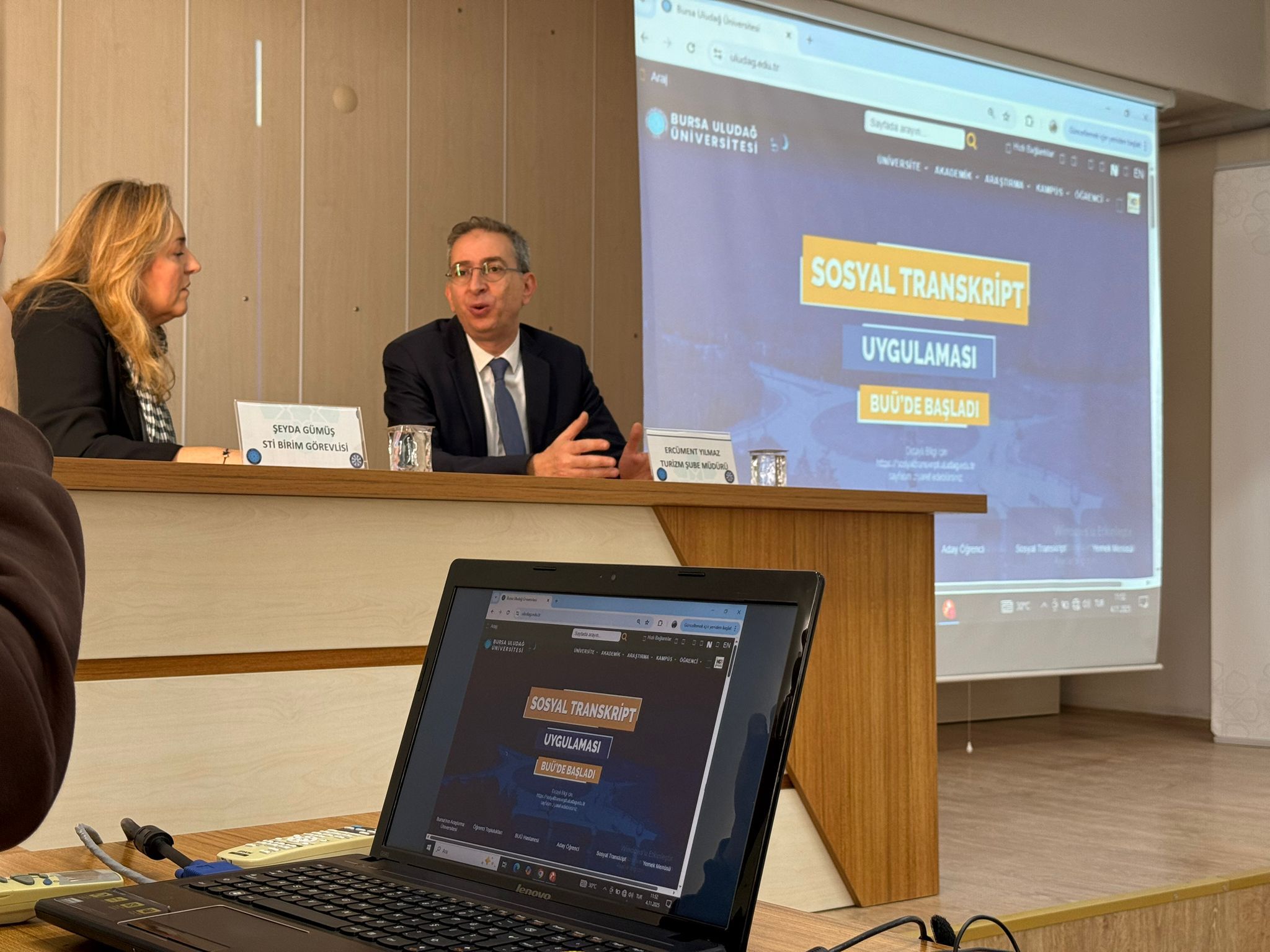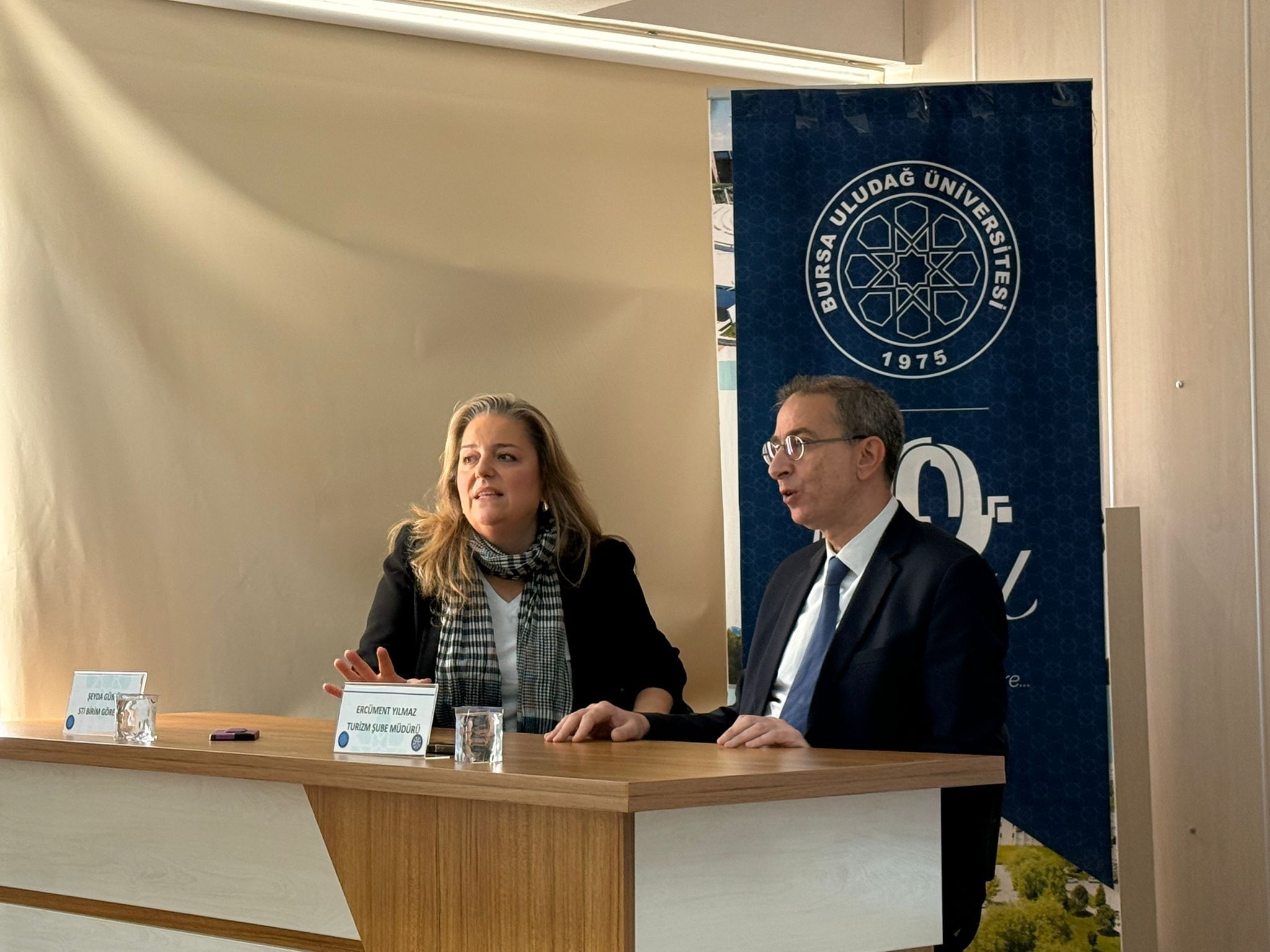 Turizm ve Seyahat Hizmetleri ile Turizm Otel İşletmeciliği Programları için düzenlenen ortak oturuma, Şeyda Gümüş (Bursa Büyükşehir Belediyesi Dış İlişkiler Daire Başkanlığı STİ Birimi Görevlisi) ve Ercüment Yılmaz (Bursa Büyükşehir Belediyesi Turizm Şube Müdürü) konuk oldu. Konuklar, Bursa’nın turizm potansiyeli, kültürel mirasın tanıtımı, turizm sektöründe yeni trendler ve belediye projeleri üzerine bilgilendirici bir sunum gerçekleştirdiler.